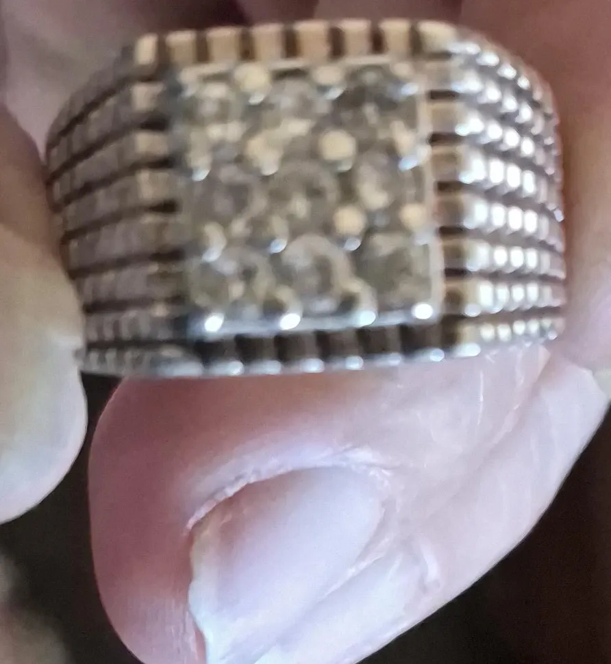 This men's ring has a silver-tone finish and is accented with clear stones set in a square pattern. It features a ridged band design. The ring's band is approximately 1cm wide.