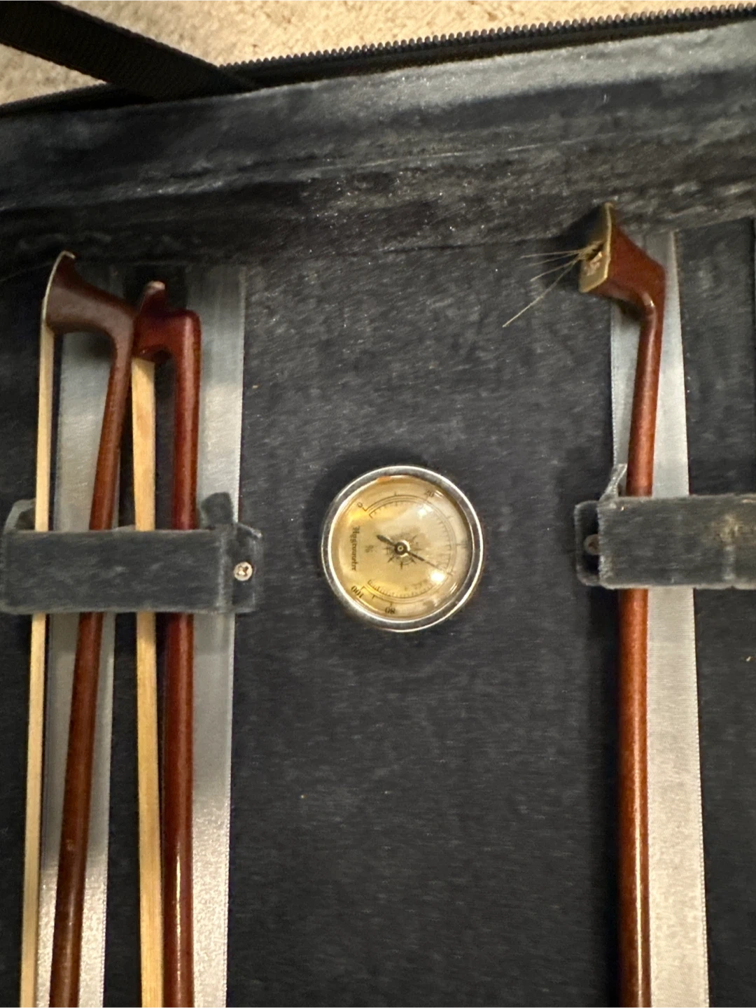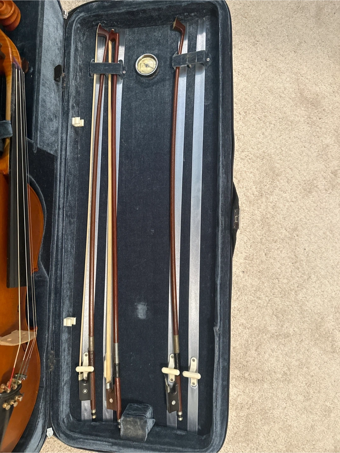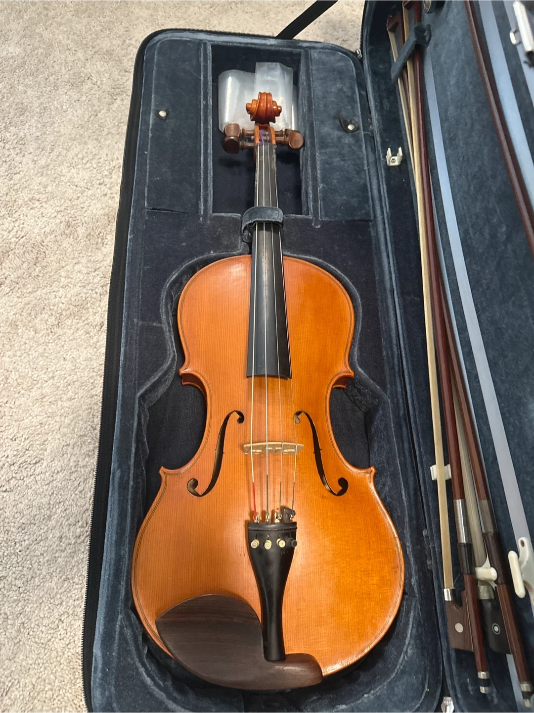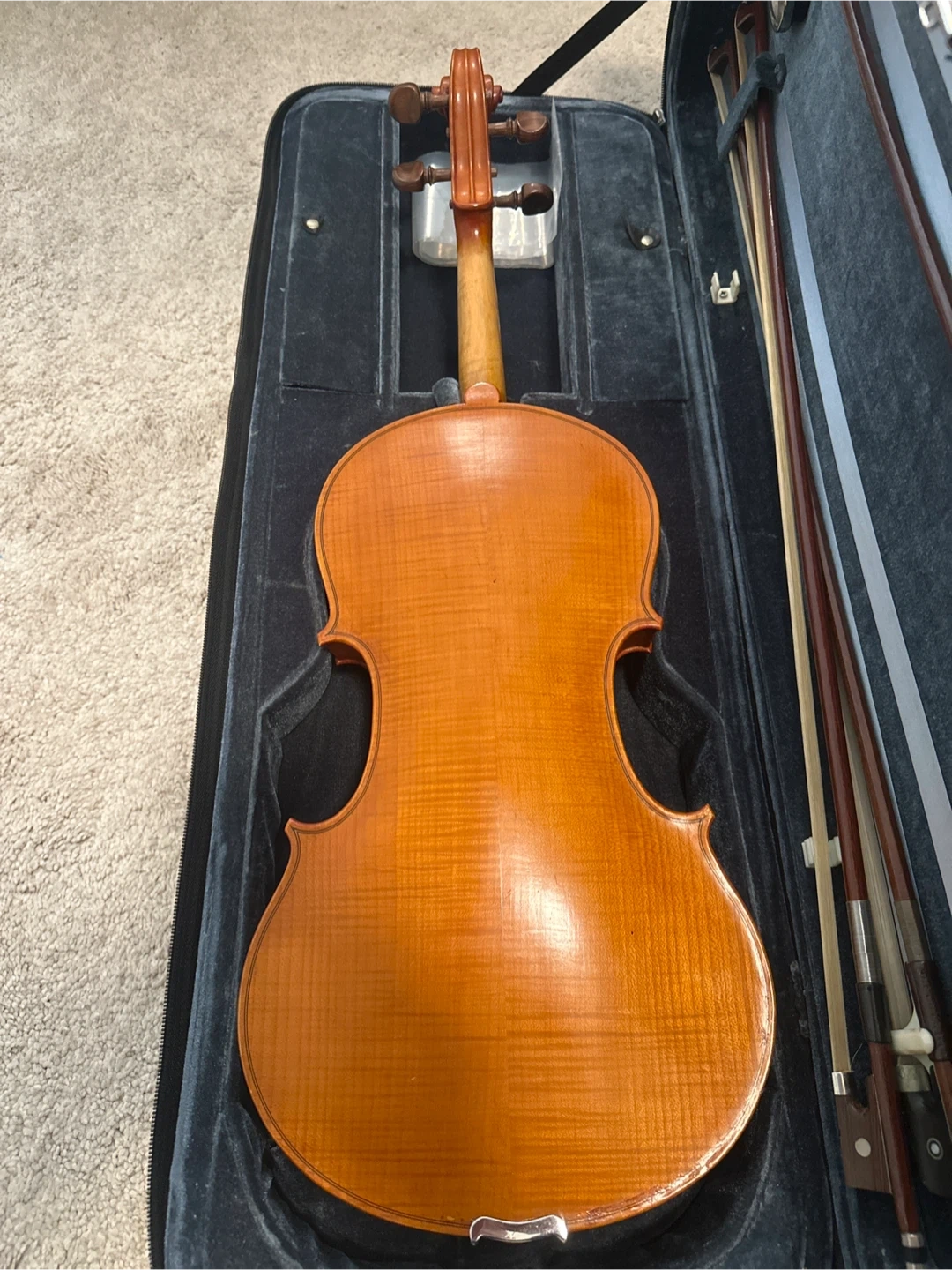This is a viola full size, with its old case and three bows. Case comes with a built-in hygrometer. The viola has a warm, orange-brown wood finish. Excellent condition.