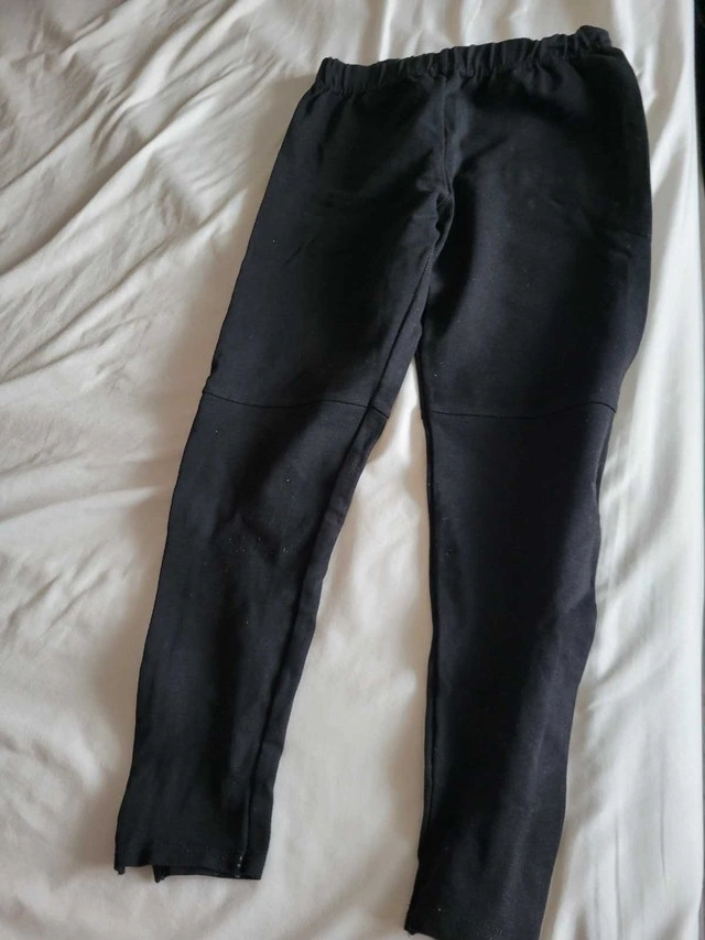 Fit size 27-28? These gently worn girls' leggings are made from a comfortable blend of 68% cotton, 26% nylon, and 6% spandex, making them perfect for active play or lounging around. The black colour makes them versatile for any outfit. I'd say these leggings are in good condition, ready for a new home and new adventures!