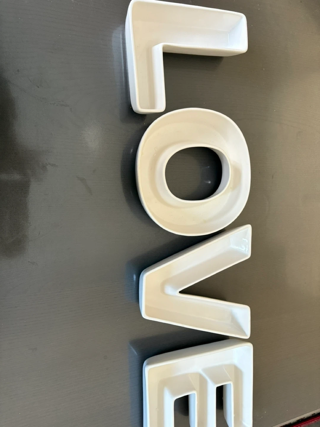 Set of four white decorative dishes spelling out "LOVE". These dishes are shaped like letters and have a shallow depth. They're made of a ceramic-like material. These would be neat for holding small trinkets or for serving tiny appetizers!
