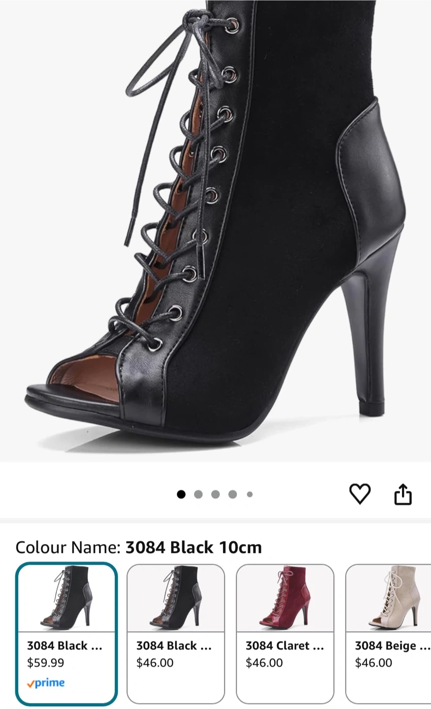 Black leather and suede ankle boots with a lace-up front and peep-toe design. They have a 10cm heel height and ankle shaft. These boots are great for dancing and offer good ankle support.