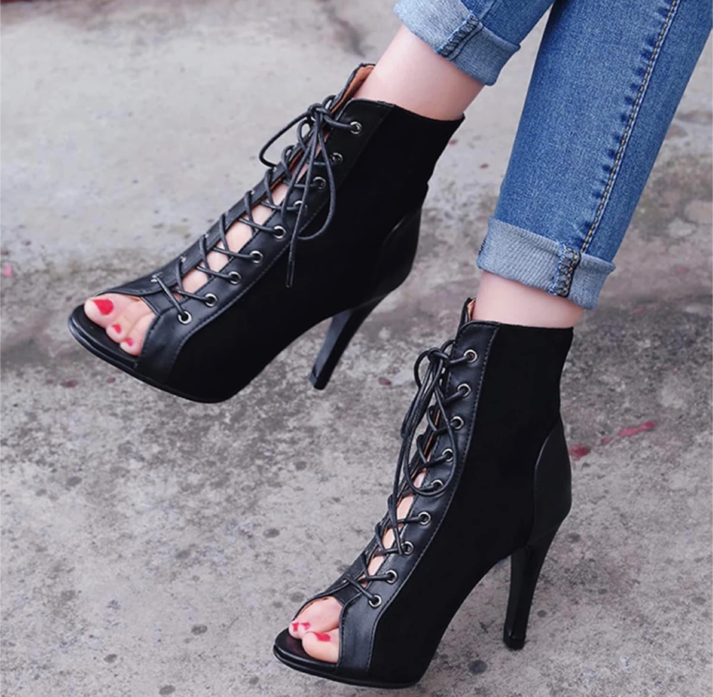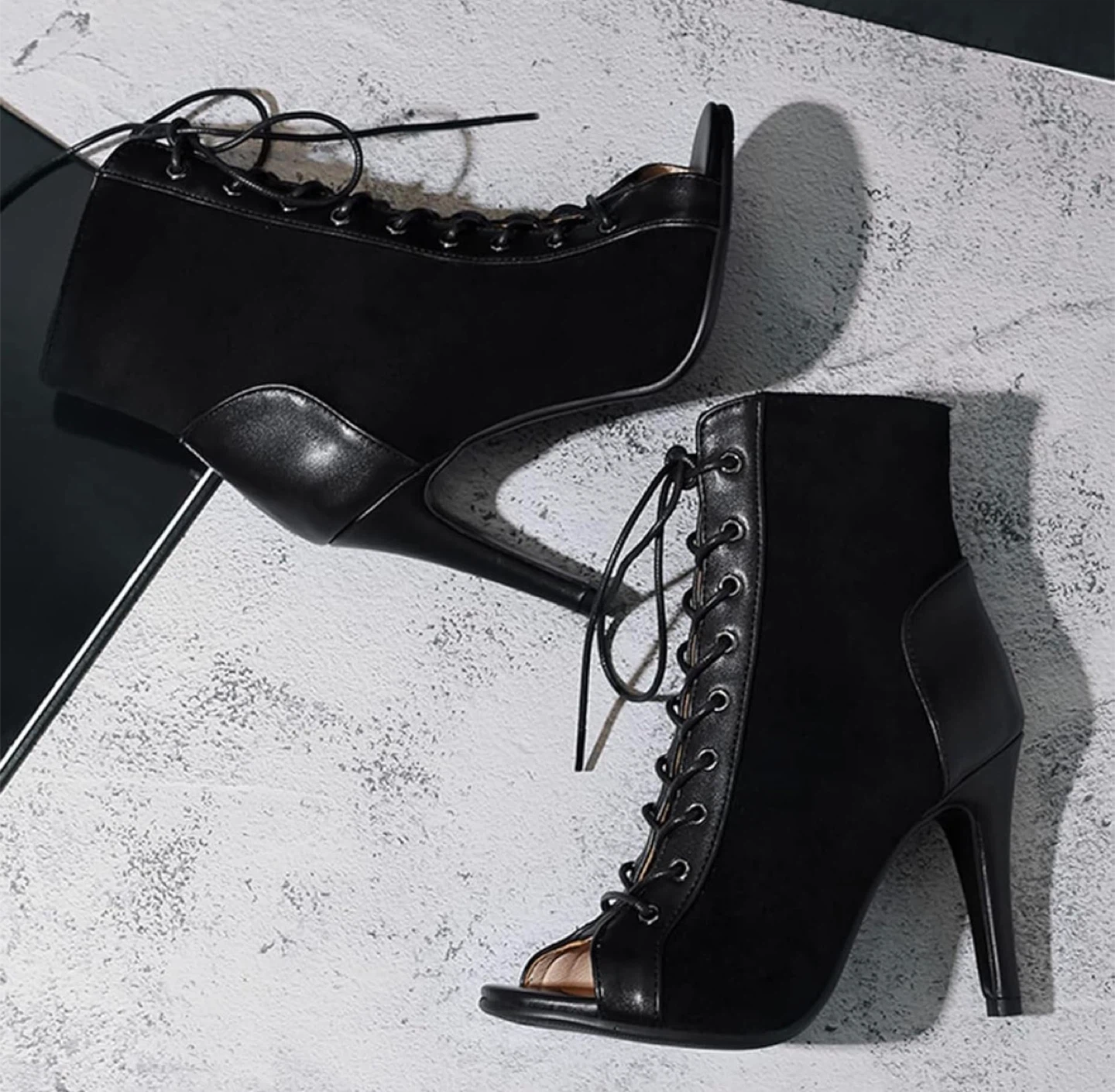 Black leather and suede ankle boots with a lace-up front and peep-toe design. They have a 10cm heel height and ankle shaft. These boots are great for dancing and offer good ankle support.