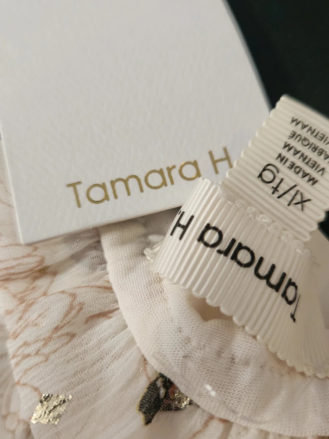 Tamara H. dress with a cute butterfly print. Ruffled neckline with a tie detail and a smocked waist. Elasticized cuffs on short sleeves. Lightweight fabric with a tiered skirt. Lots of stretch to it. Never worn. Has original tags. And has lining underneath. Size XL