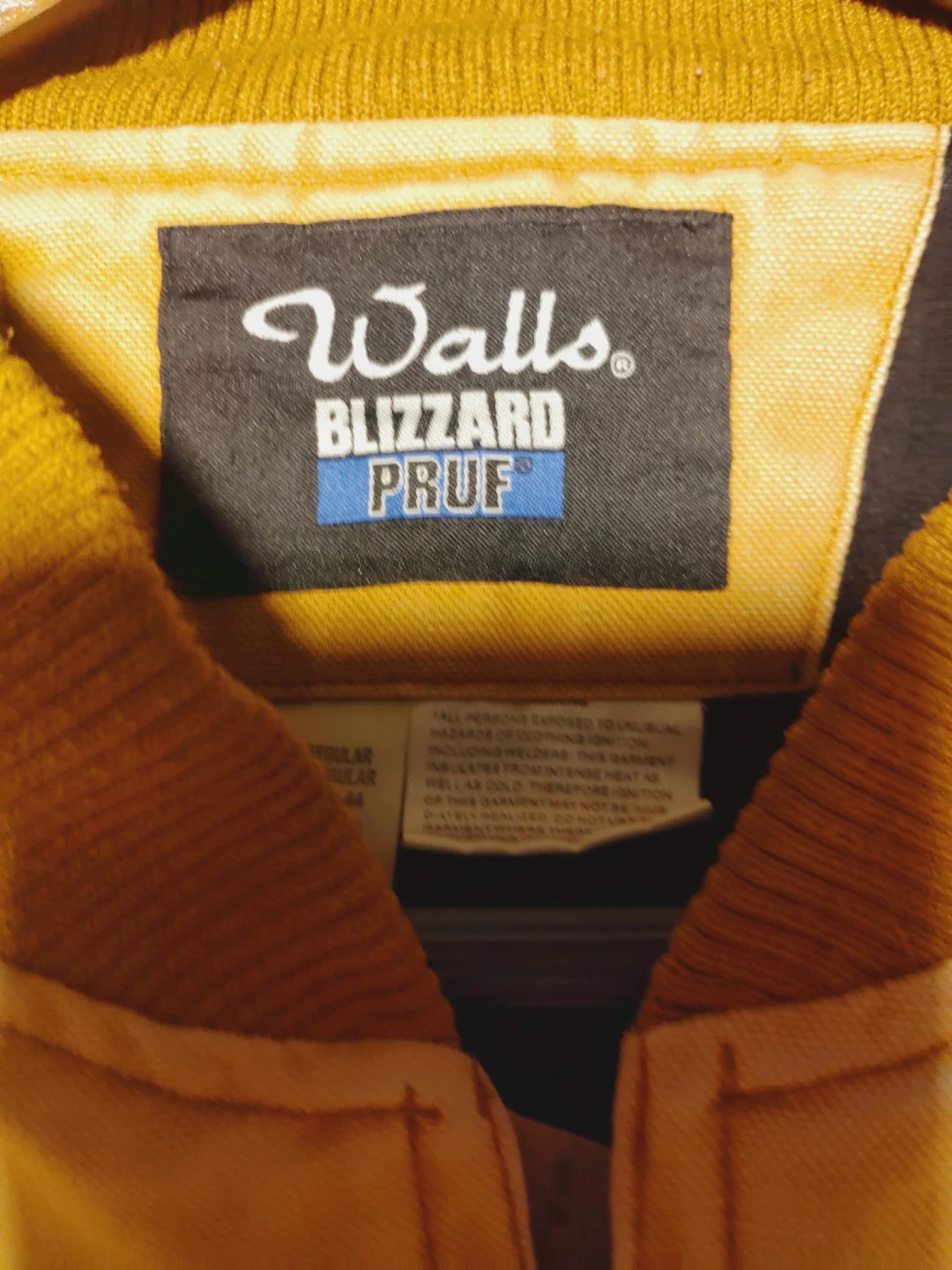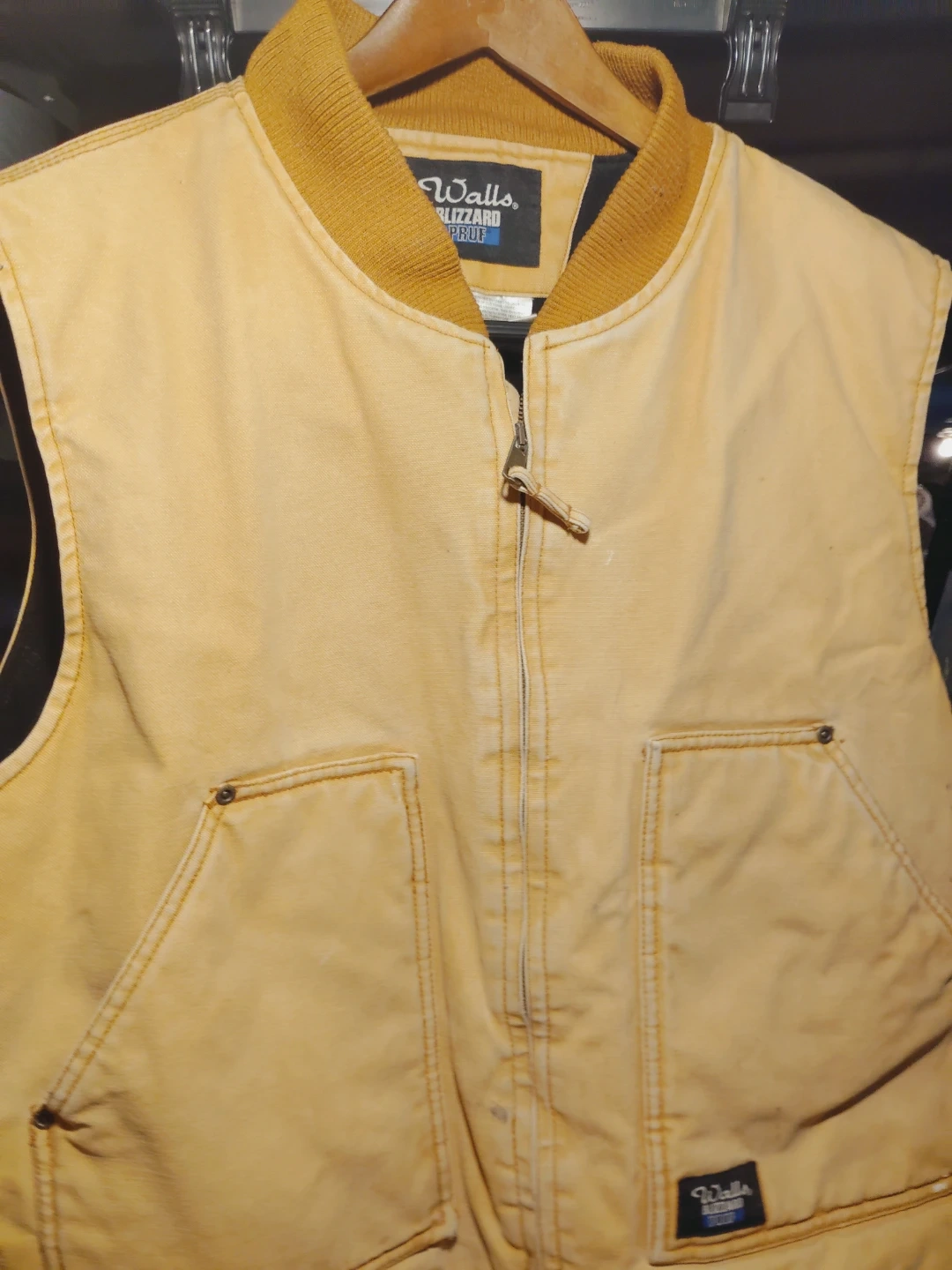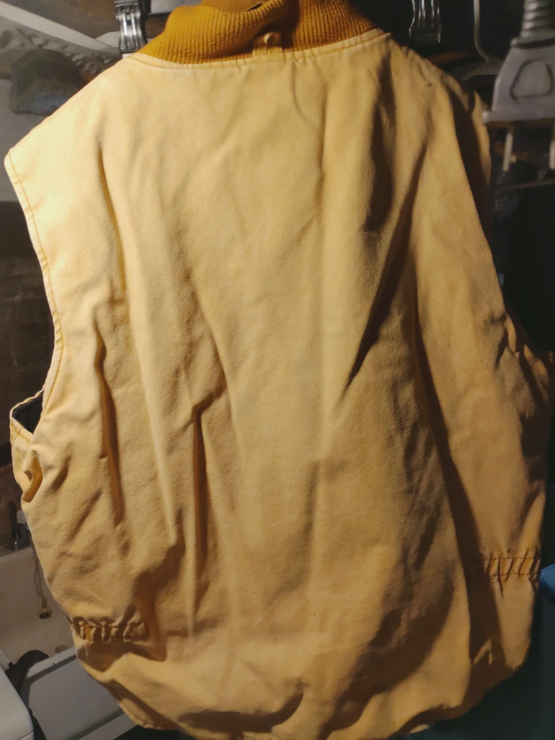 Yellow canvas insulated vest. Features a zip front closure and two front pockets. Corduroy collar and elasticated sides.