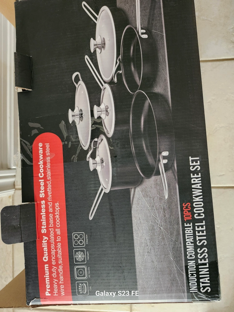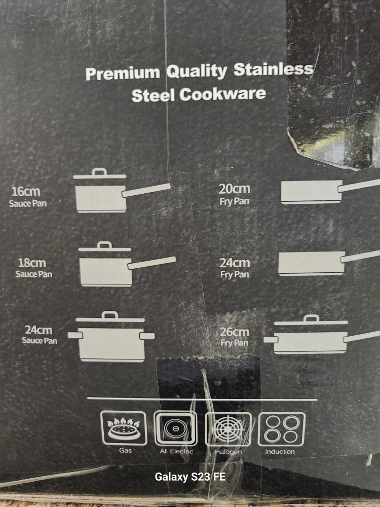 Stainless steel cookware set. Induction compatible. Includes various sauce and fry pans. Heavy-duty encapsulated base and riveted stainless steel wire handle suitable to all cooktops.