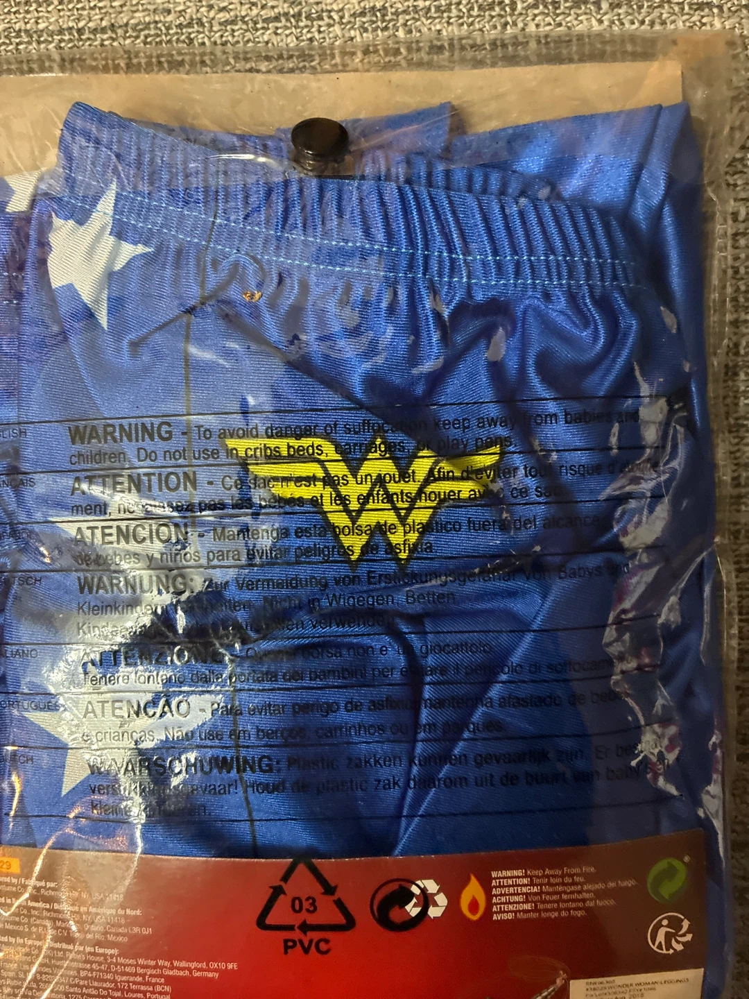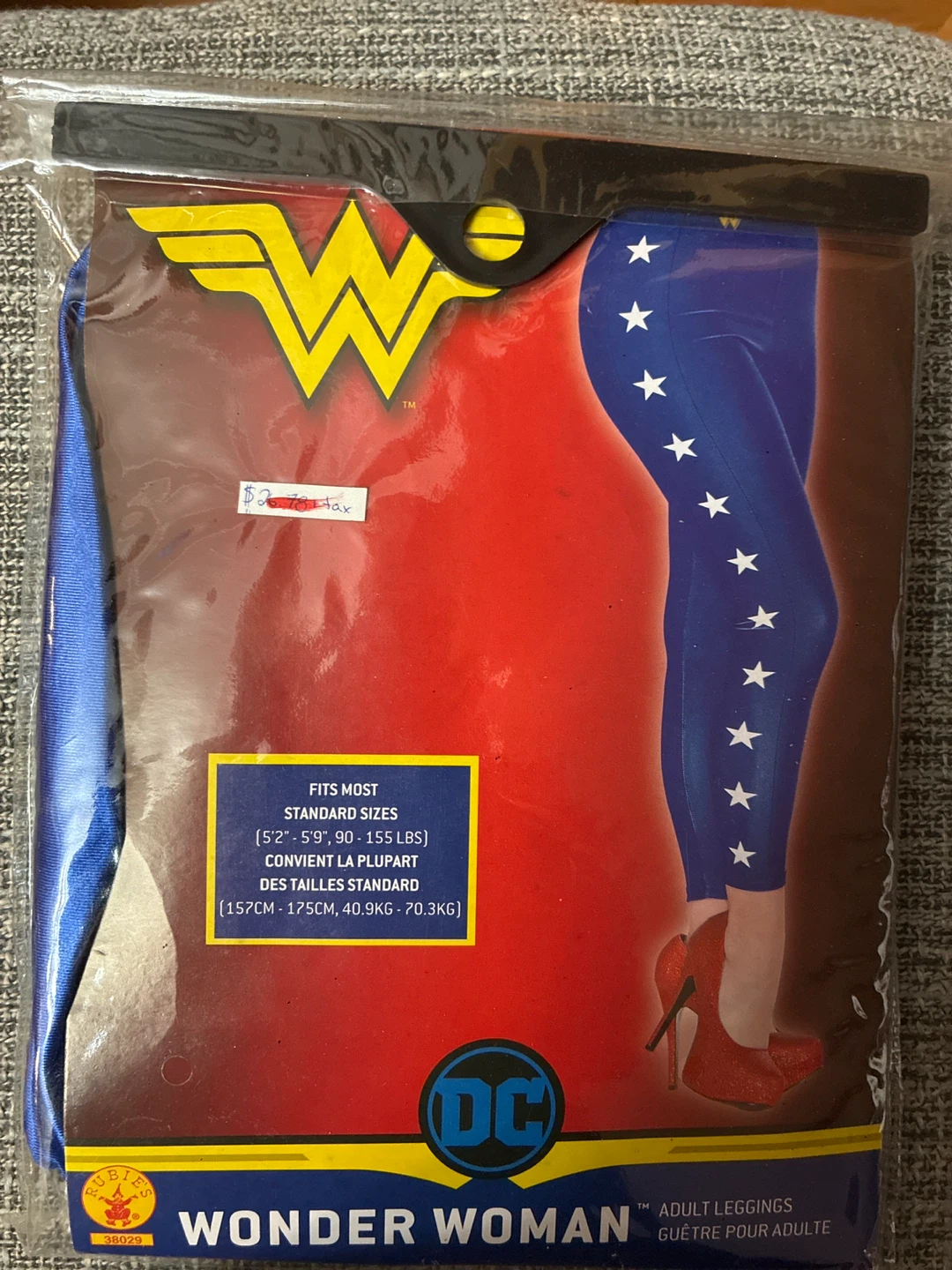 These are near adult leggings featuring the Wonder Woman design. They fit most standard sizes, accommodating heights from 5'2" to 5'9" and weights from 90 to 155 lbs. Perfect for costume parties or themed events!