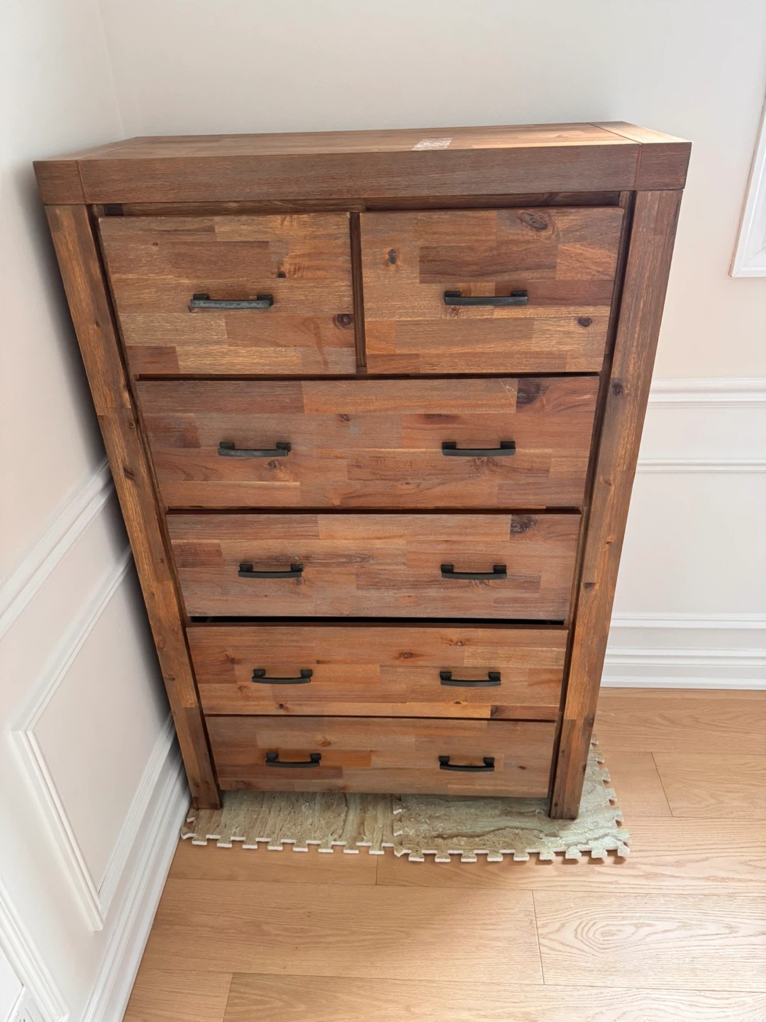 Tall dresser with a rustic wood finish and seven drawers. It has a mix of two smaller drawers at the top and five larger drawers below. Black metal drawer pulls add a nice contrast. It's a great piece for bedroom storage!