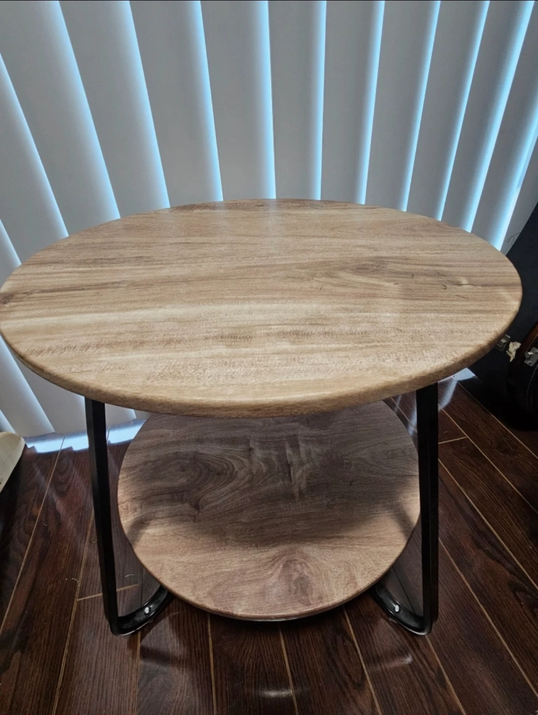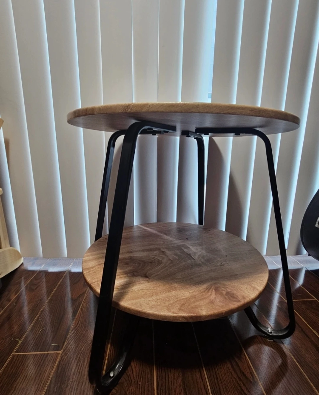 This is a two-tiered round end table. It's made with a wood top and shelf, supported by black metal legs. The natural wood grain offers a rustic look.
