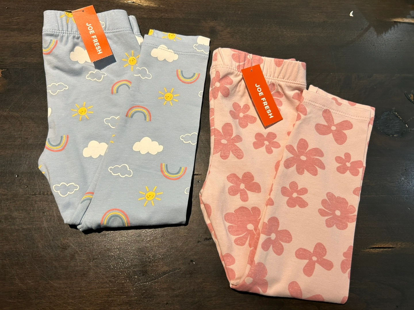 Two pairs of Joe Fresh toddler leggings, both size 2! One pair is pink with a floral pattern, and the other is blue with a rainbow, cloud, and sun pattern. Perfect for your little one!