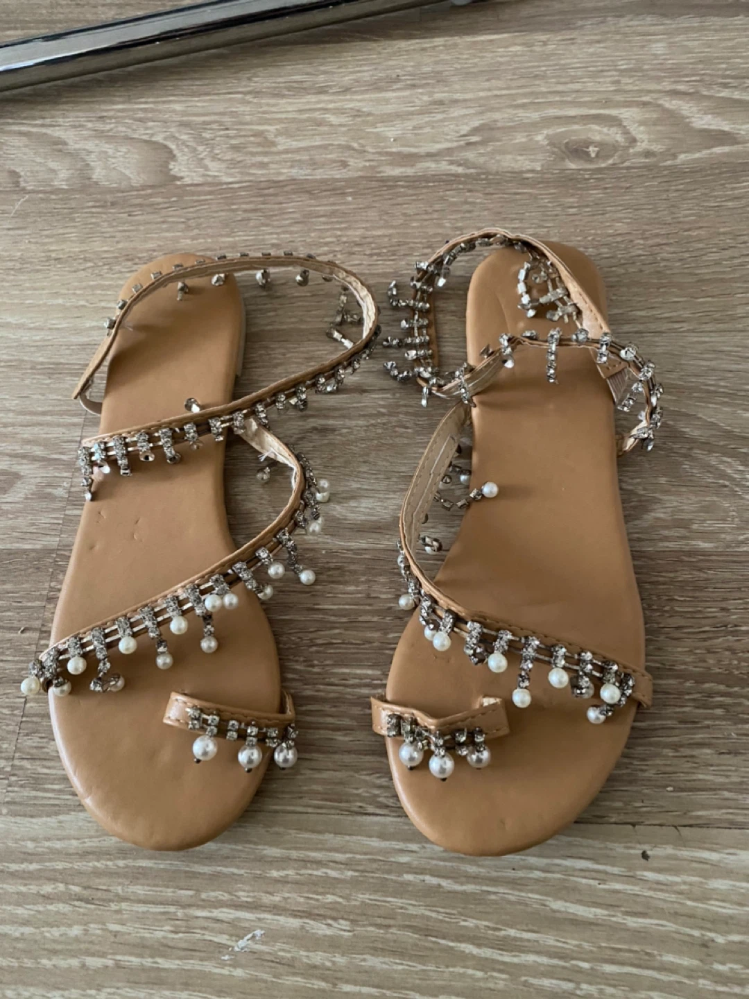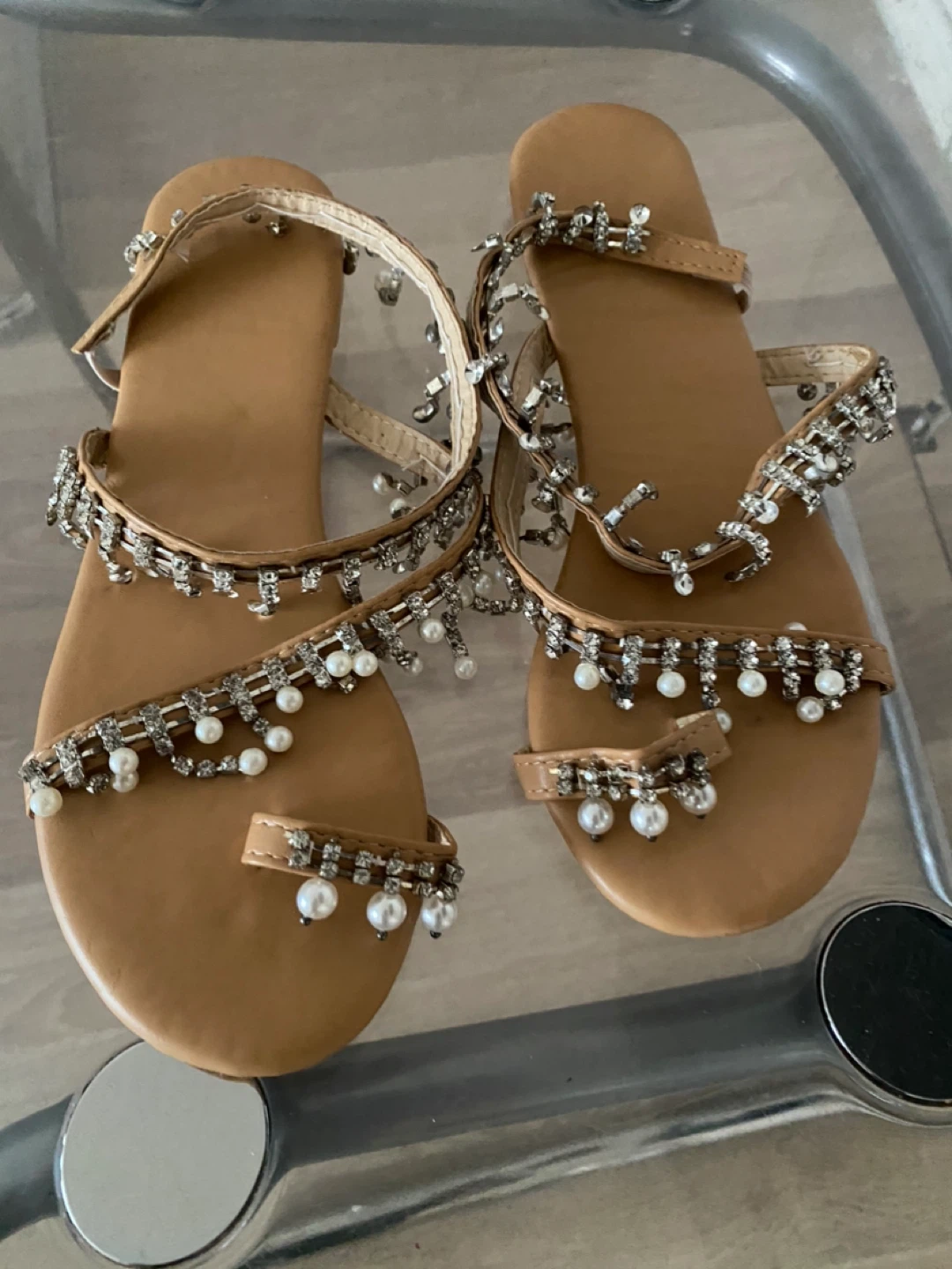 These stylish flat sandals feature delicate embellishments with rhinestones and pearls. The tan straps offer a secure and comfortable fit. Perfect for adding a touch of sparkle to any casual outfit!
