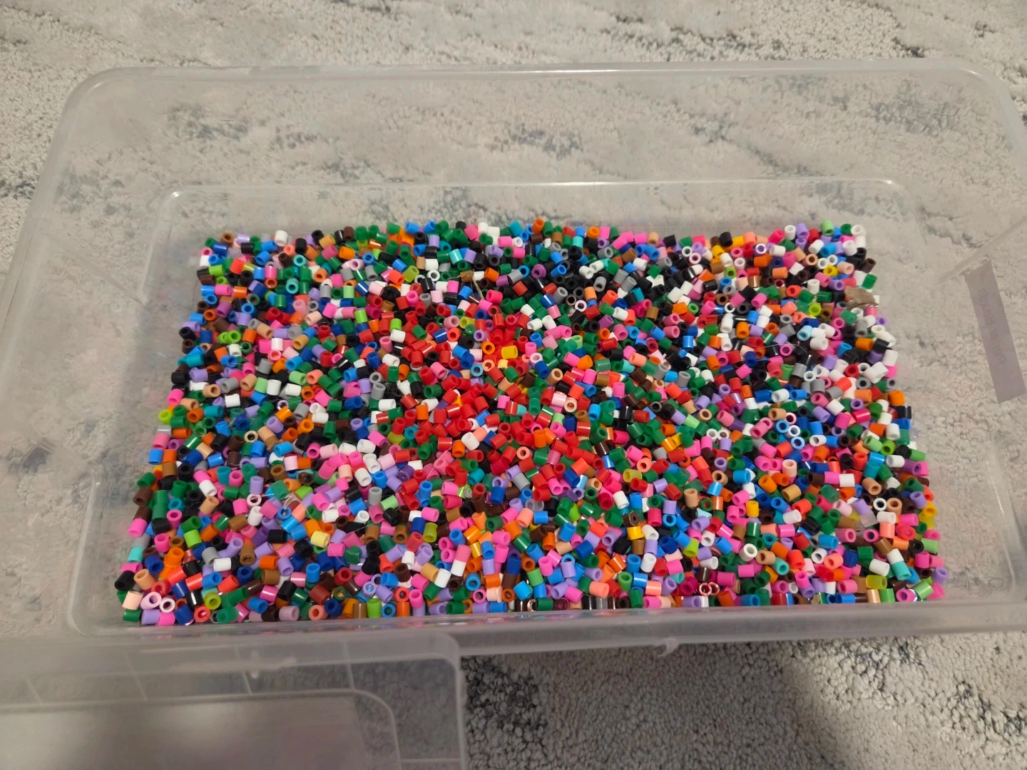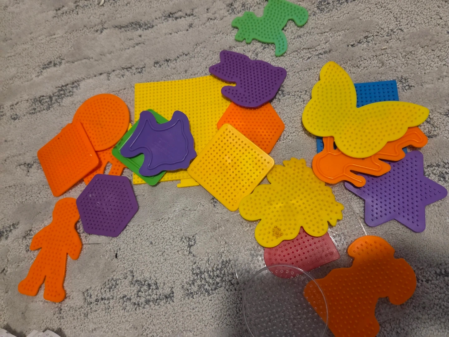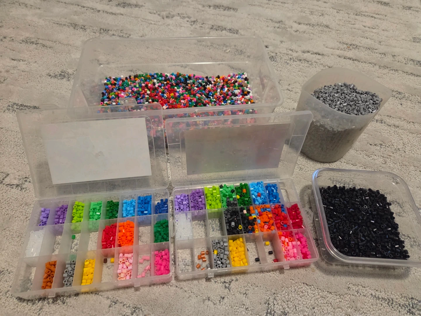 This is a large assortment of Perler beads in various colours, including a large container of mixed beads, two divided storage containers, and separate containers of grey and black beads. It also includes multiple pegboards in various shapes like circles, squares, and character-specific designs, along with some pattern sheets and iron paper. Ideal for crafting and creative projects!