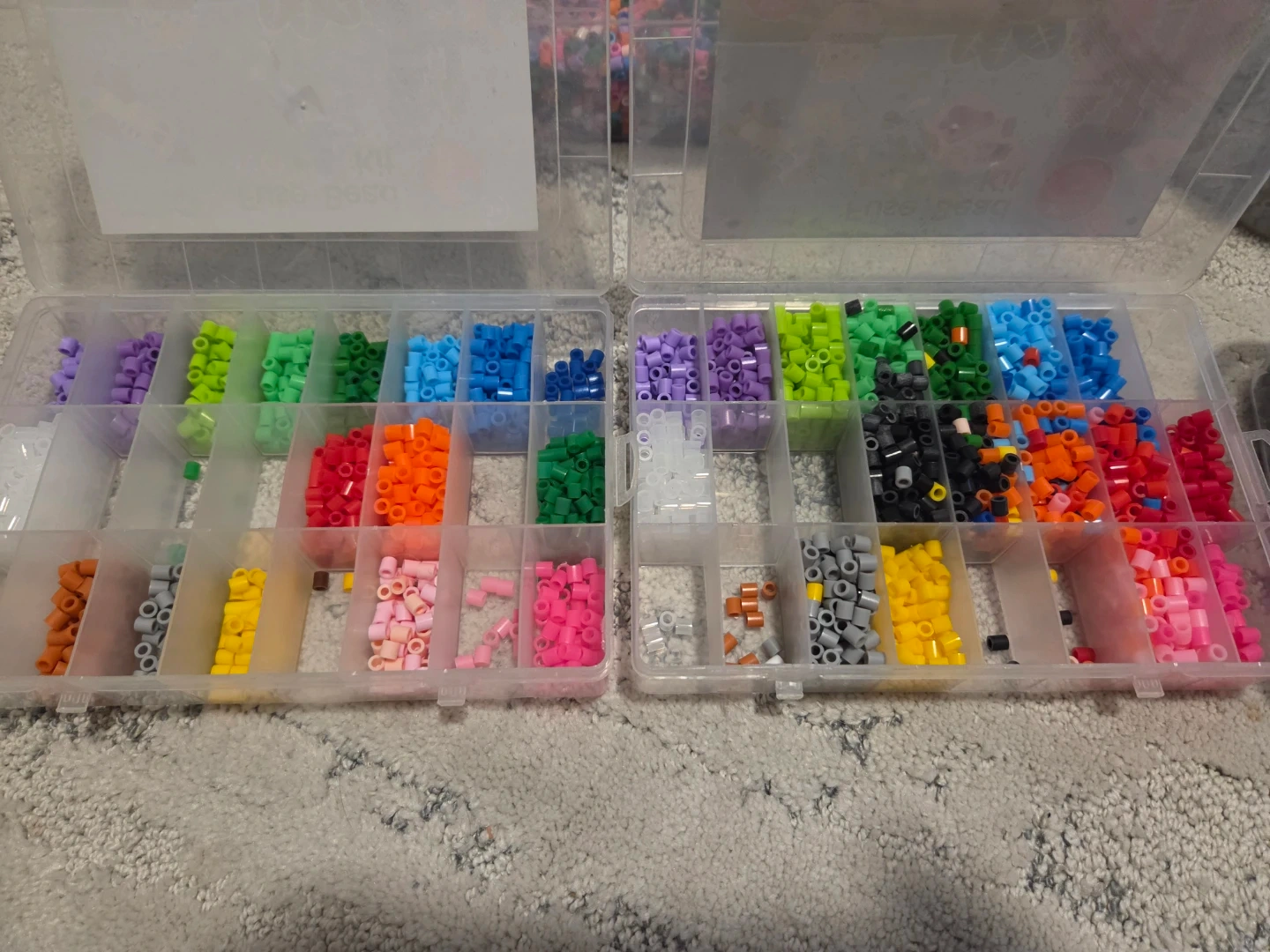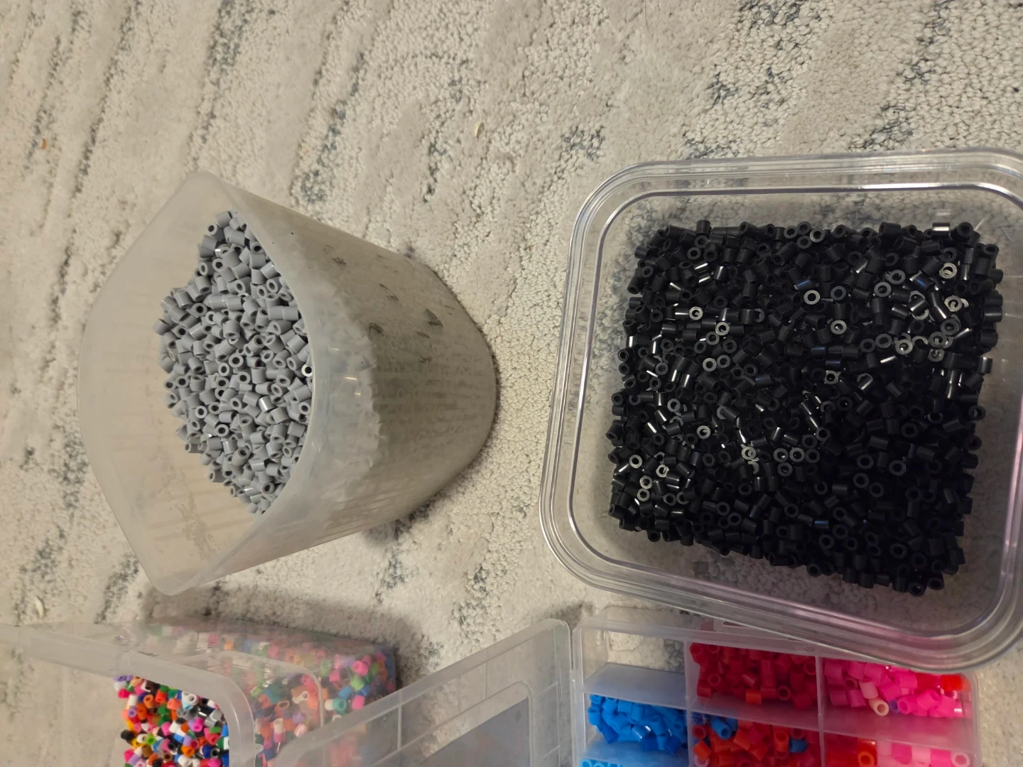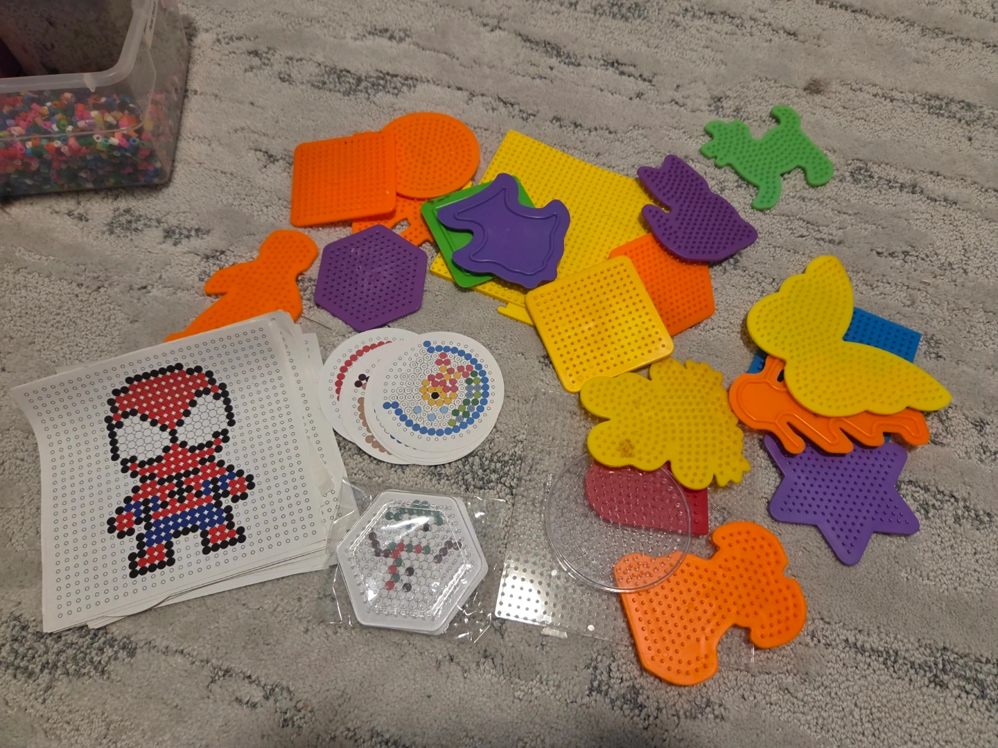 This is a large assortment of Perler beads in various colours, including a large container of mixed beads, two divided storage containers, and separate containers of grey and black beads. It also includes multiple pegboards in various shapes like circles, squares, and character-specific designs, along with some pattern sheets and iron paper. Ideal for crafting and creative projects!