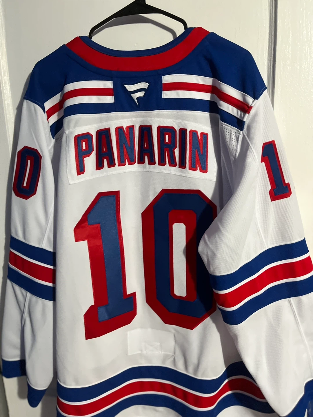 Selling a Fanatics New York Rangers jersey with Panarin's name and number 10. The jersey is a size 56. It's white with blue and red accents. The tag shows it originally cost $230