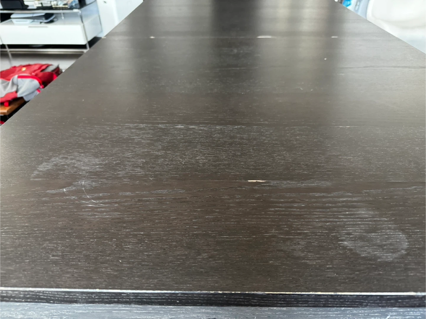 This dining table has a dark wood finish with some discolouration on the legs. It's a sturdy piece for your dining room. The table is long and can seat multiple people comfortably. It is from ikea from several years ago. Shows bubbling and surface imperfections.