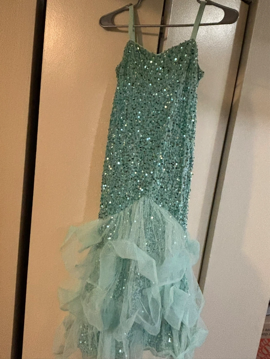Sparkly sequined mermaid-style dress in a lovely mint green. It features spaghetti straps and a tiered tulle ruffle hem. This dress is sure to shine at any special occasion!