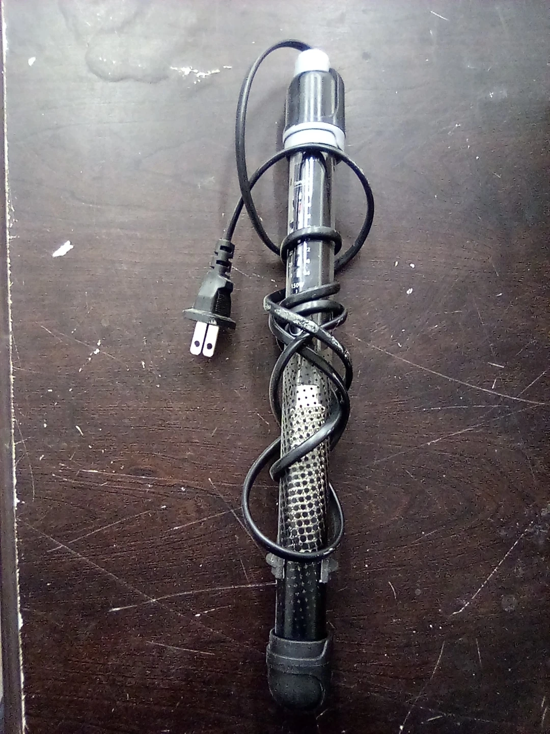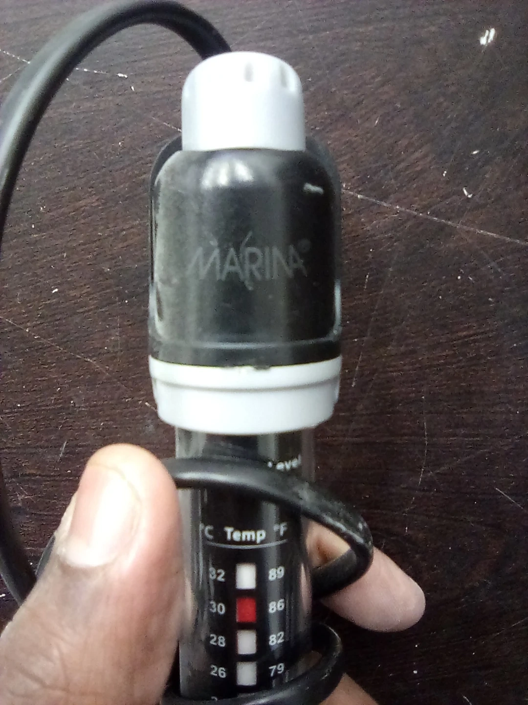 This is a Marina submersible aquarium heater. It's designed to maintain a consistent temperature for your fish tank. The heater has adjustable temperature settings visible on the unit.