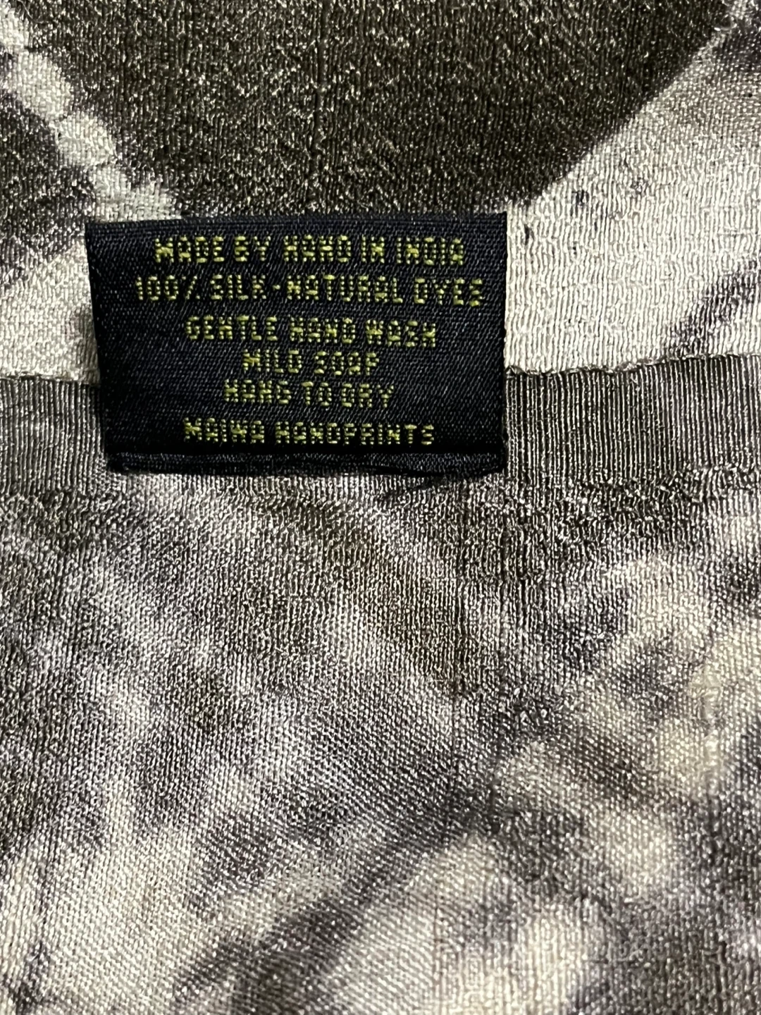 This Maiwa Handprints scarf is made of 100% silk with natural dyes. It's a beautiful hand block print from India. Gentle hand wash with mild soap and hang to dry.