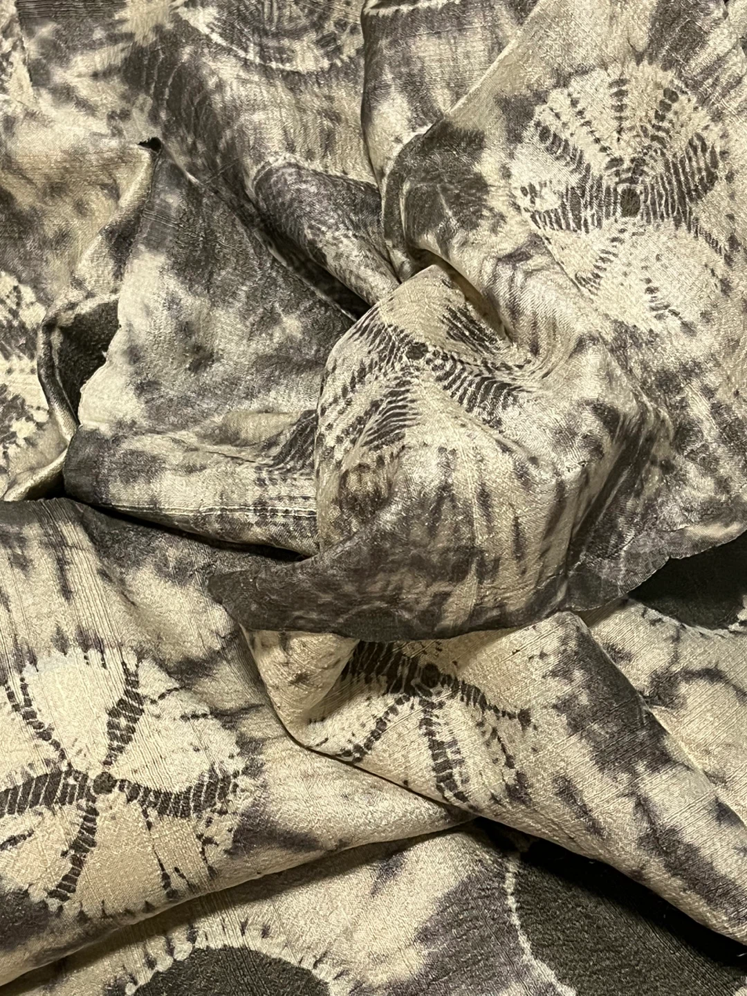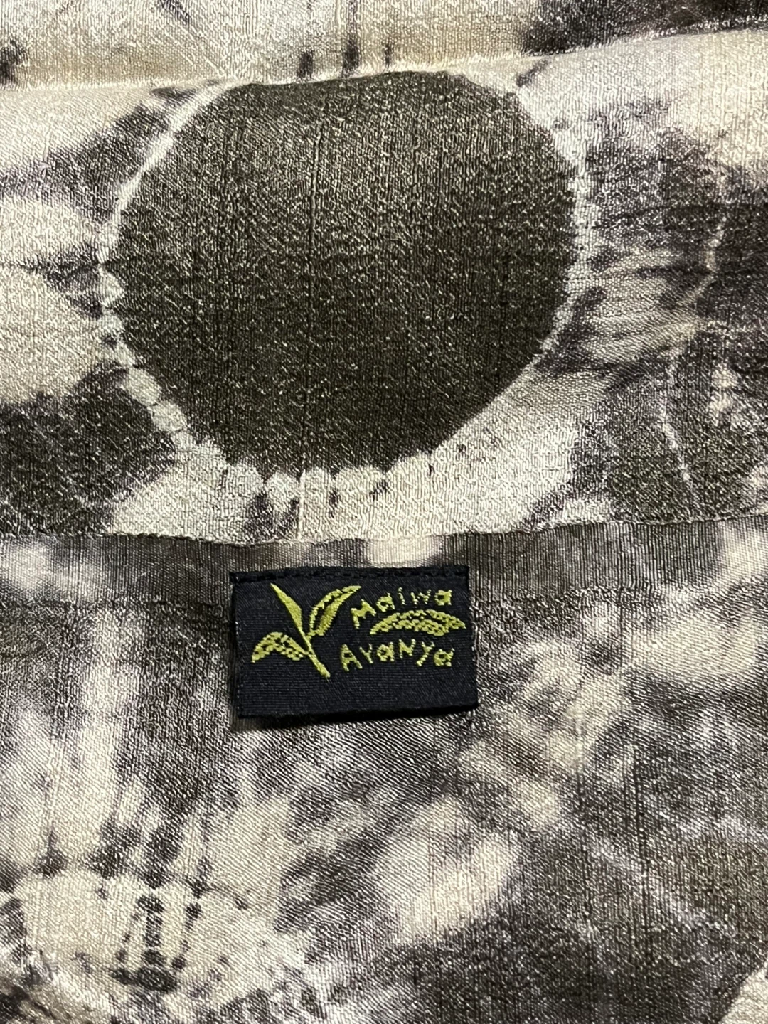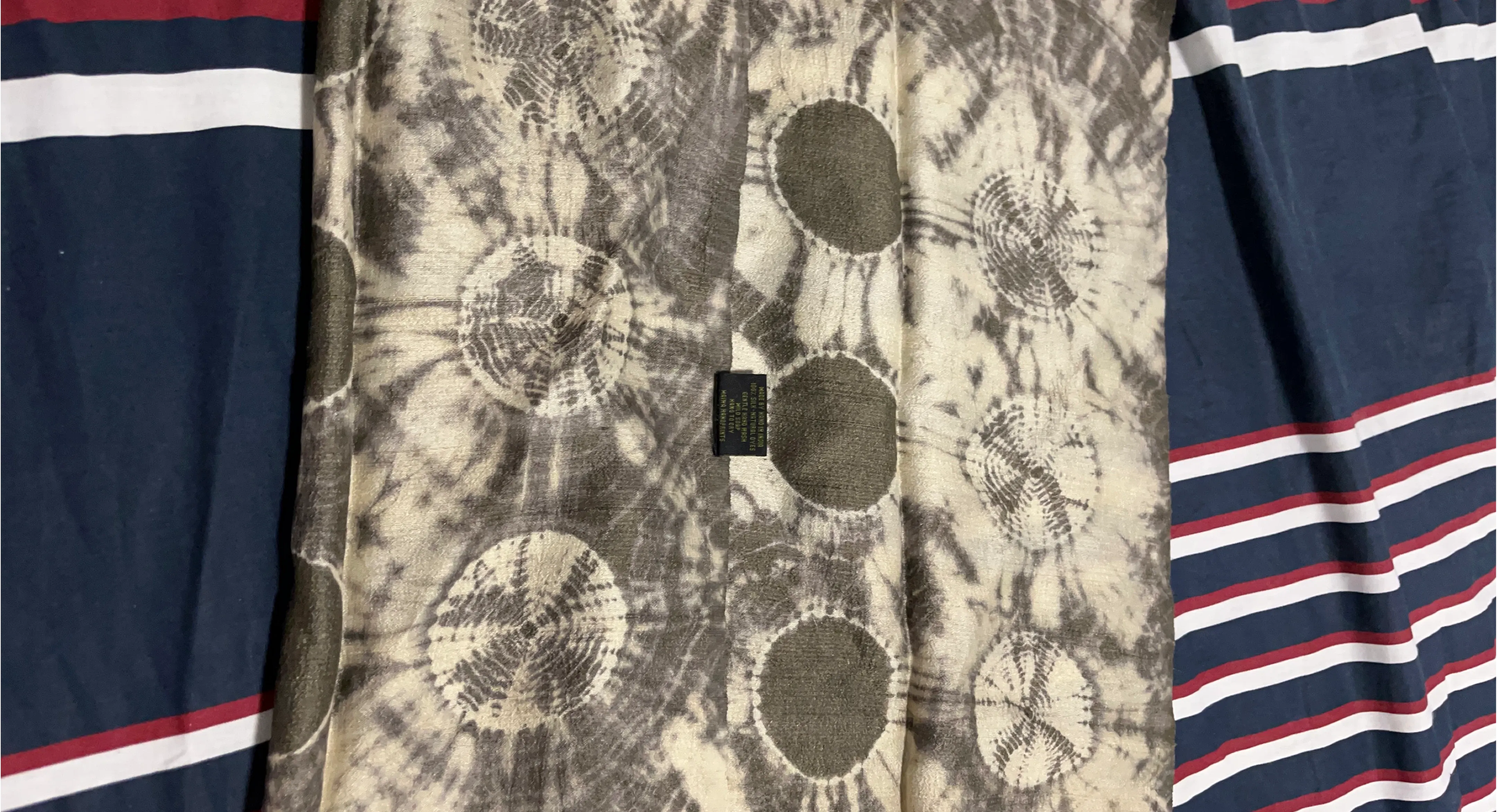 This Maiwa Handprints scarf is made of 100% silk with natural dyes. It's a beautiful hand block print from India. Gentle hand wash with mild soap and hang to dry.