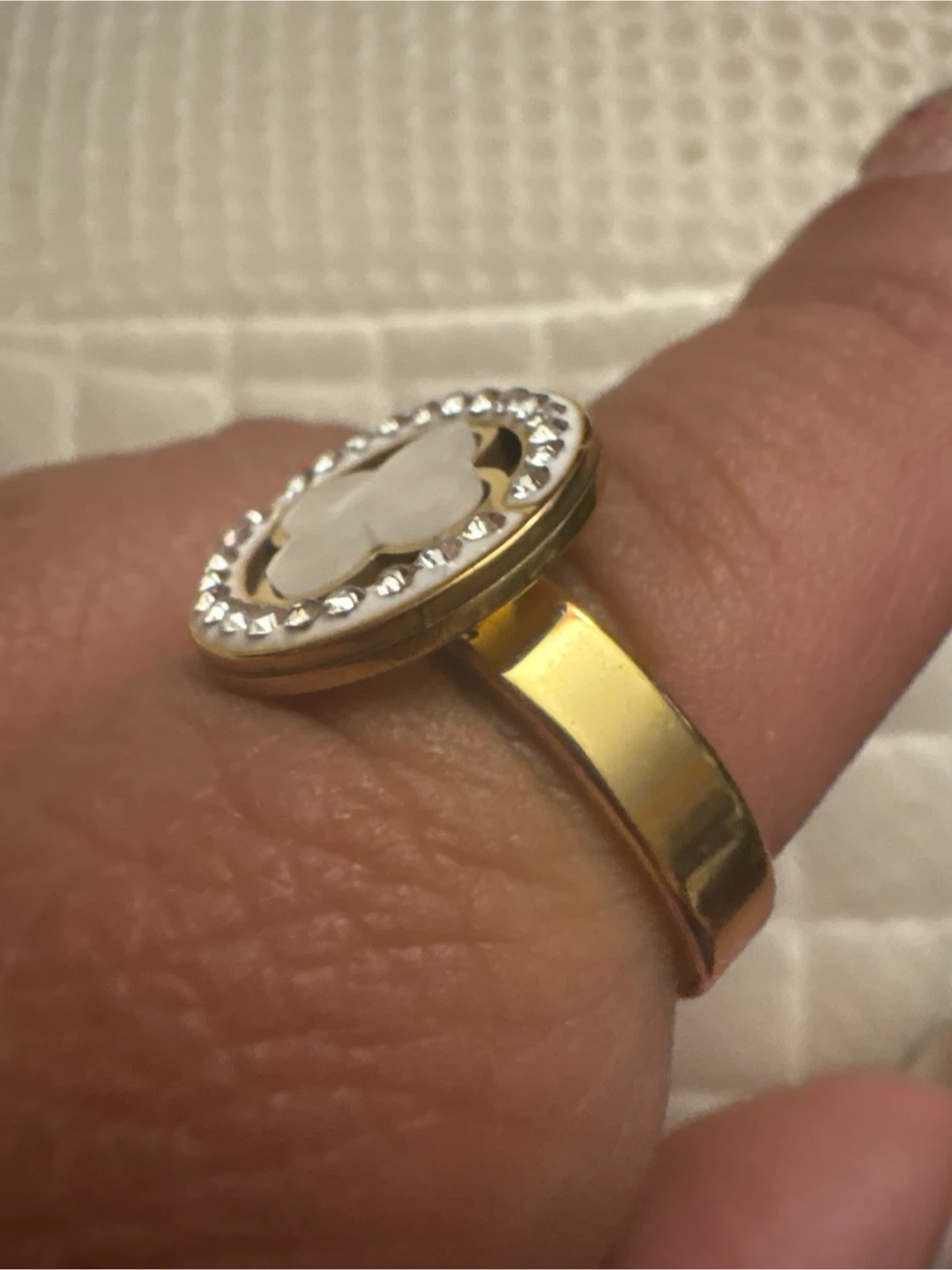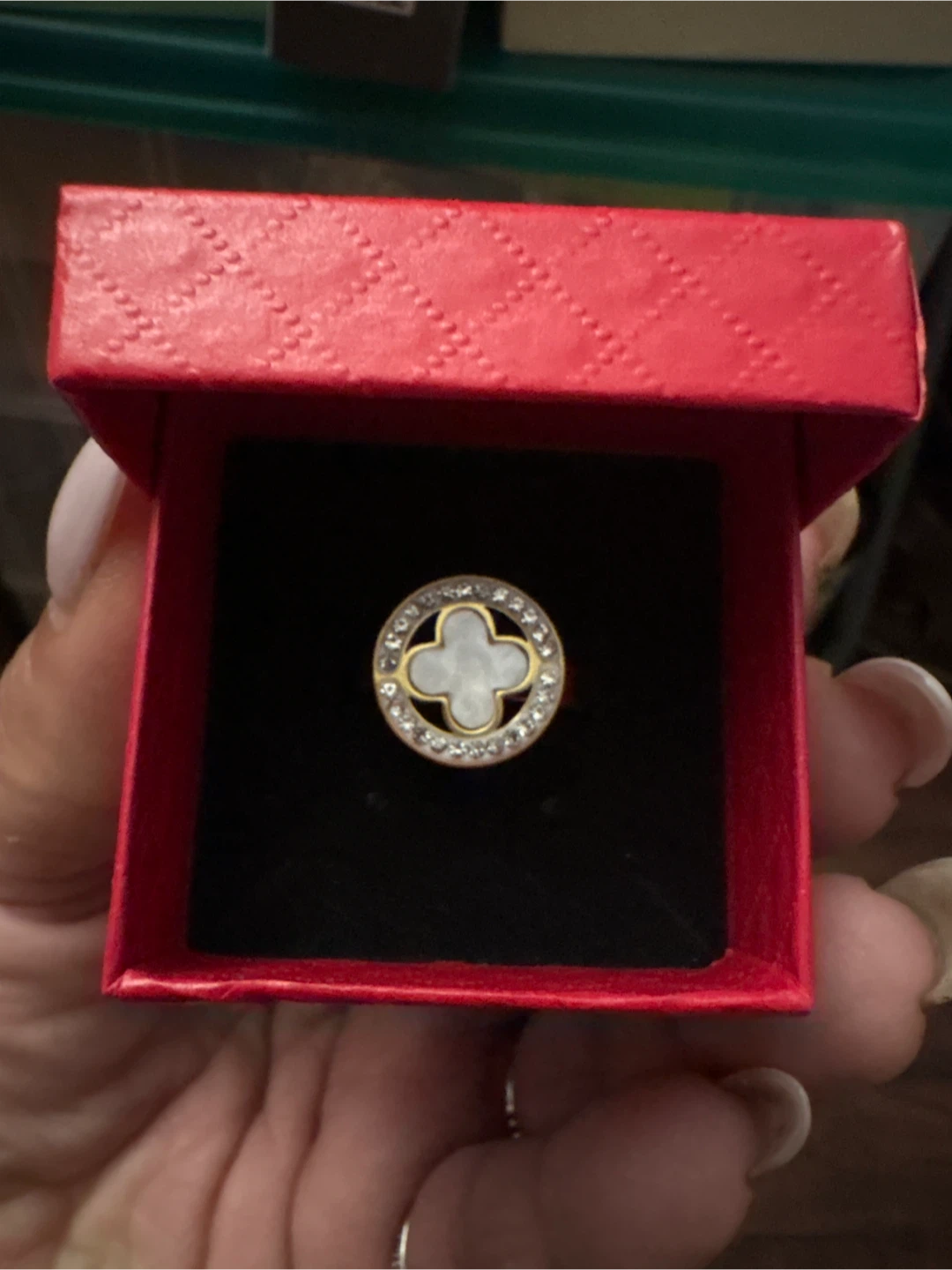 This is a 18K Gold Stainless Steel ring with a mother of pearl clover design surrounded by rhinestones. It's i New and comes in a box