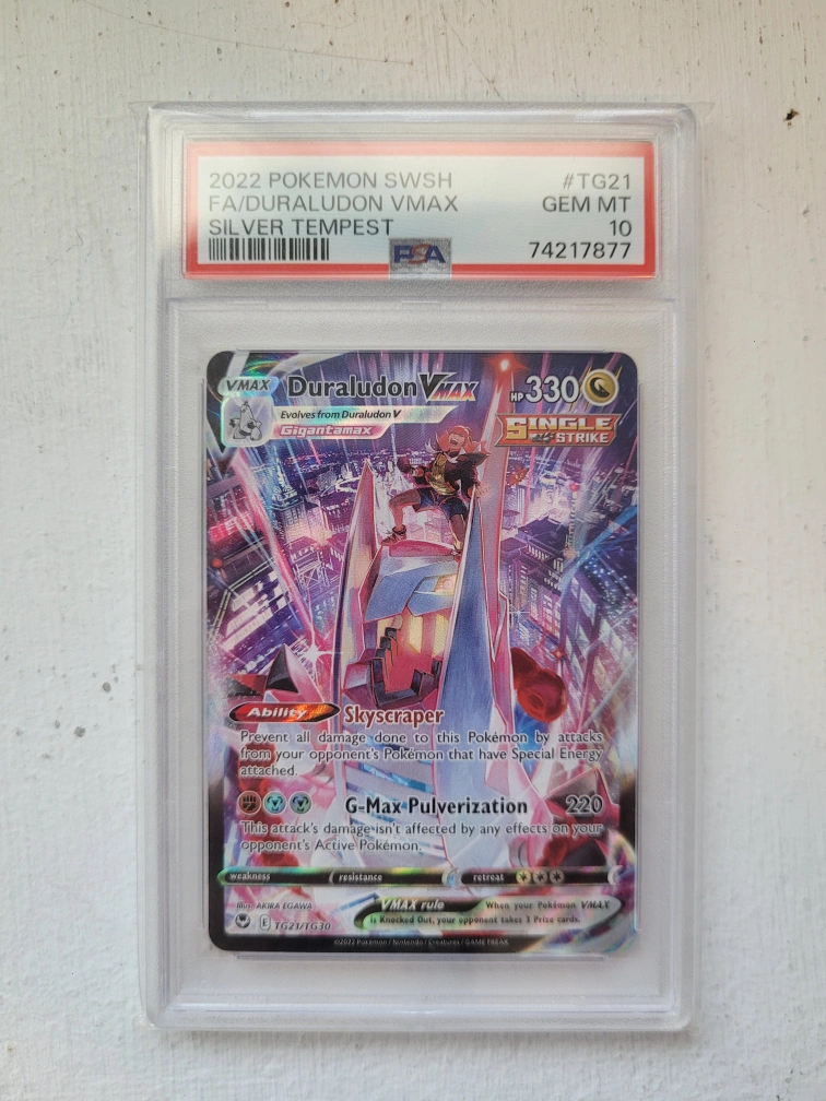 Selling a Duraludon VMAX TG21 Pokemon card, graded PSA 10. It's in gem mint condition and ready for a new home. I won this a while back at a local gaming store. Has been stored and handled with the utmost care.