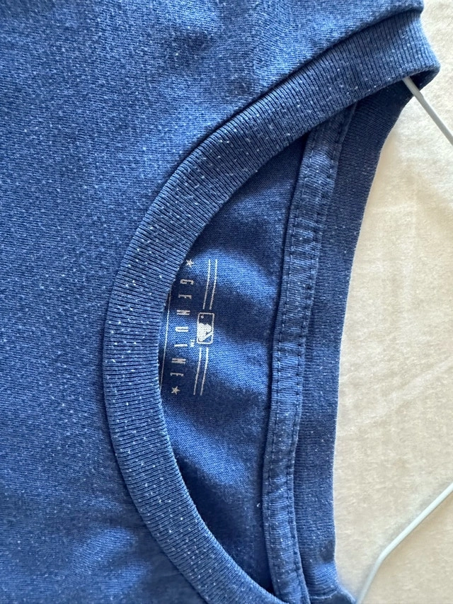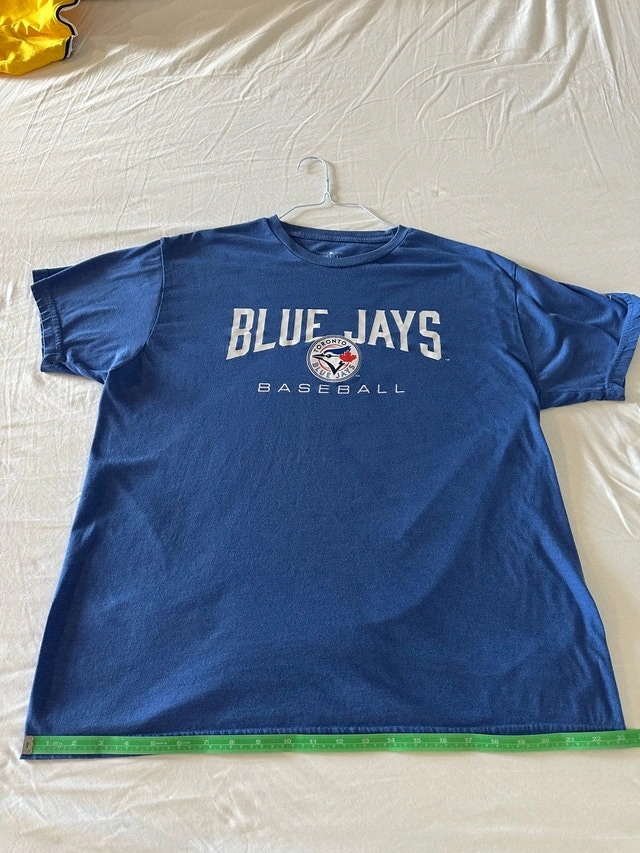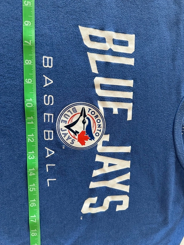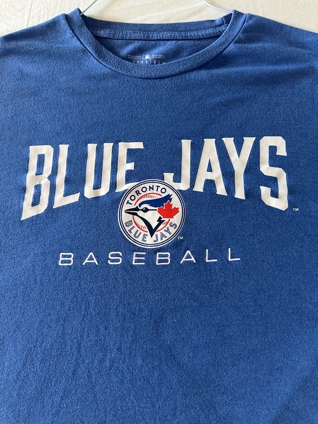 Show your team spirit with this Toronto Blue Jays T-shirt, perfect for any baseball fan! It's in good condition and ready for game day or casual wear. The shirt features the team's iconic logo and colours, making it a great addition to any wardrobe. Measurements in the photos. Worn a few times but still lots of life. Ideal as a movie prop or a wonderful addition to your Blue Jays shirt collection. We live near Highway 404 and Highway 407, very close to Vaughan, Thornhill, Richmond Hill, Aurora, Woodbridge, Bolton, Brampton, Mississauga, Scarborough, Port Credit, Etobicoke, Newmarket, Toronto, Pickering, Ajax, Nobleton, and King City. If the ad is up, it's available!