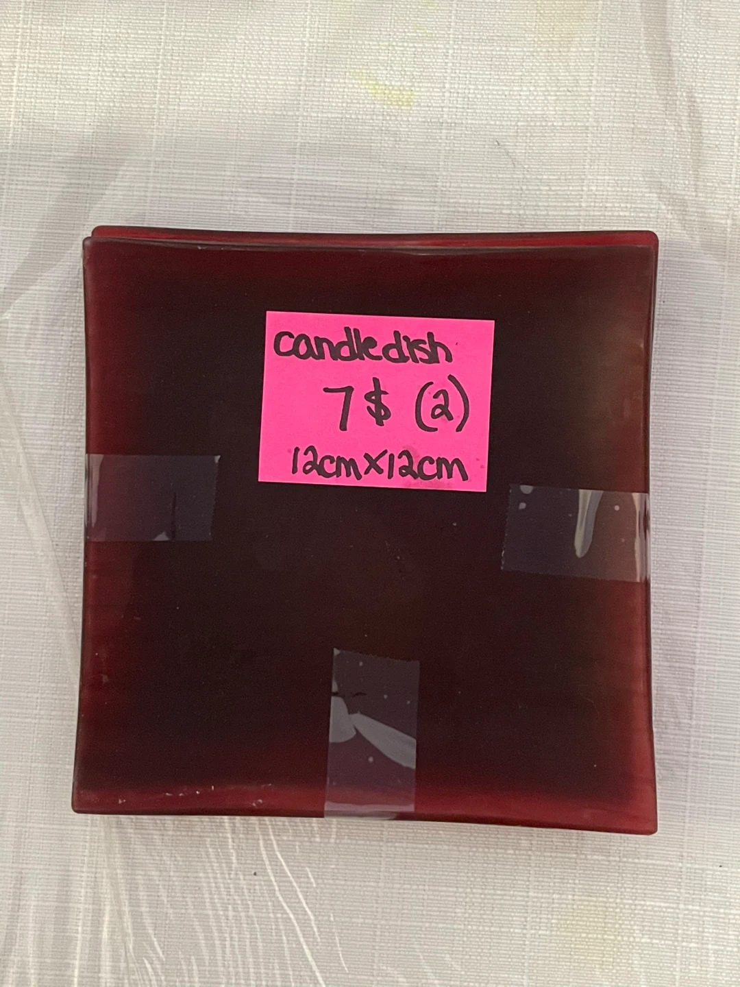 2 Glass candle dishes. They’re 12cm by 12cm. Perfect size for a table or shelf!