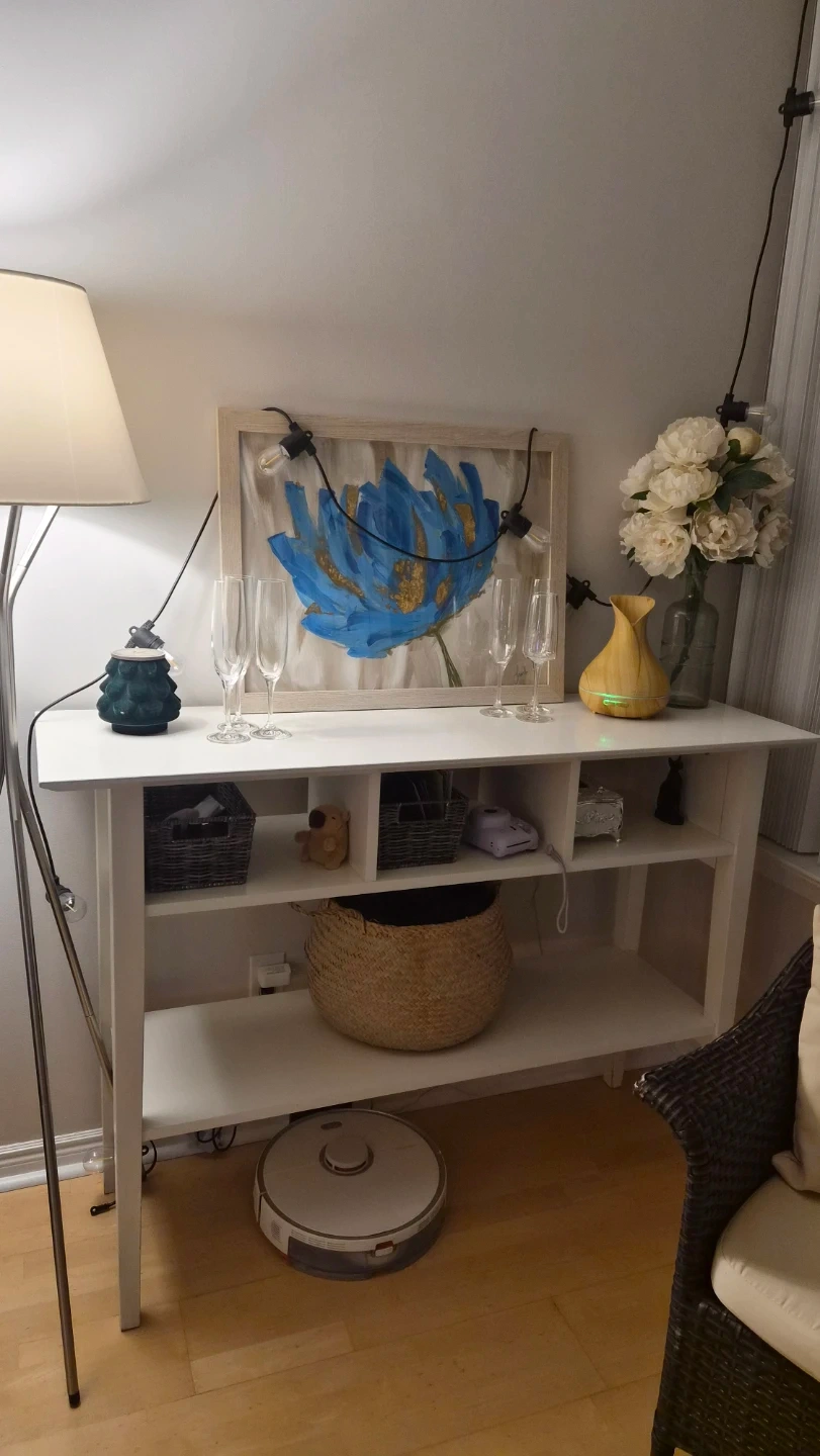 Selling a white console table that's in great shape! It measures approximately 49 inches in length and 35 inches in height. Perfect for an entryway or as a side table in your living room!