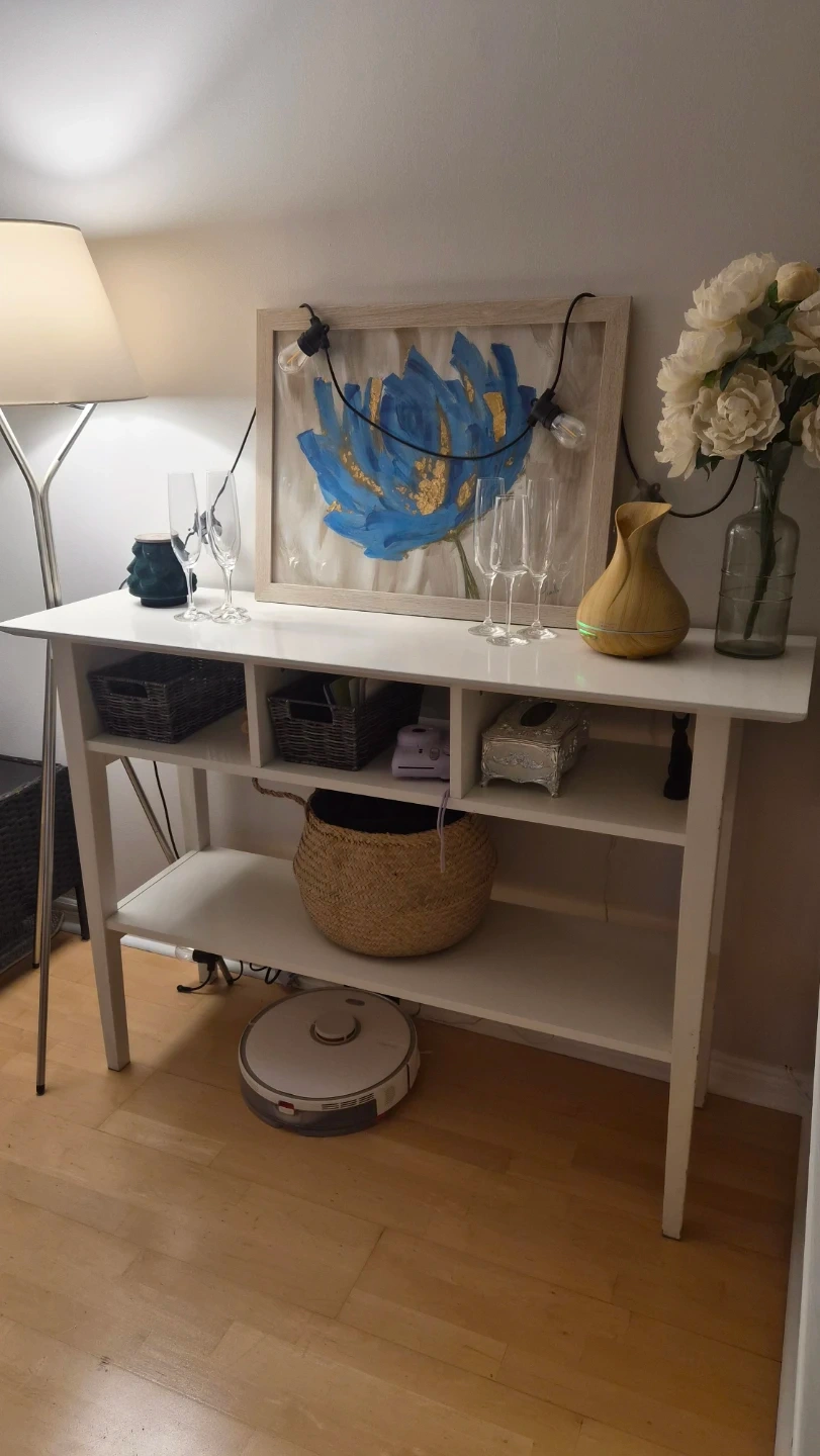 Selling a white console table that's in great shape! It measures approximately 49 inches in length and 35 inches in height. Perfect for an entryway or as a side table in your living room!