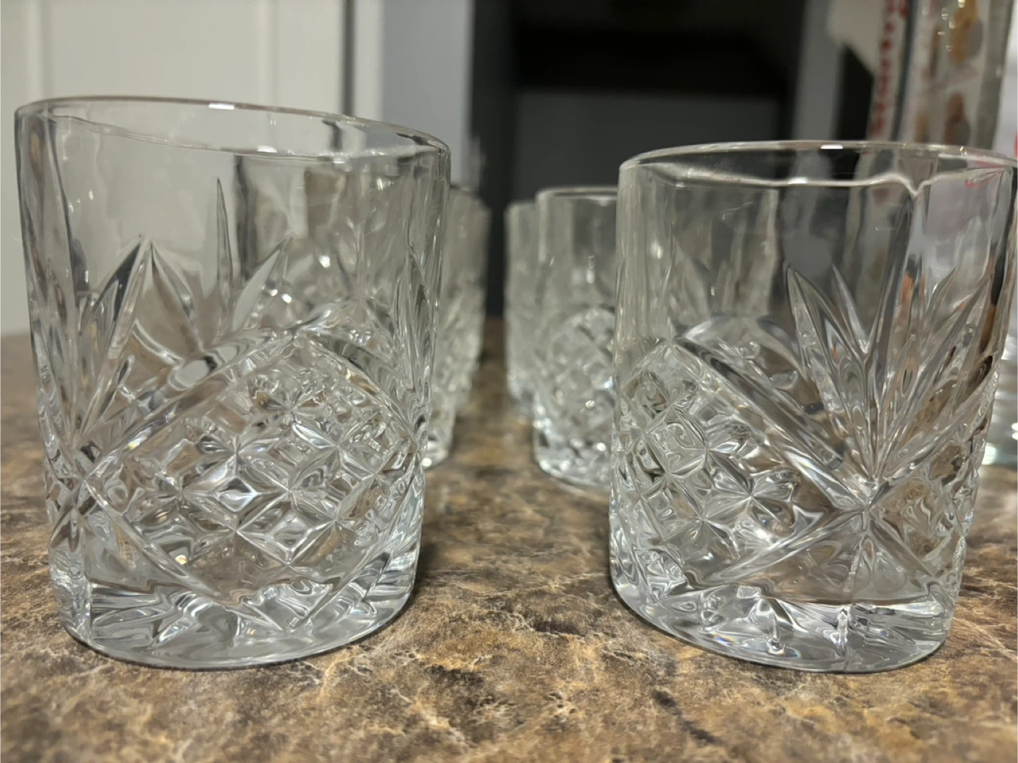 This is a set of six cut crystal old fashioned glasses. They have a classic diamond and fan pattern. These glasses are perfect for serving spirits or cocktails.
