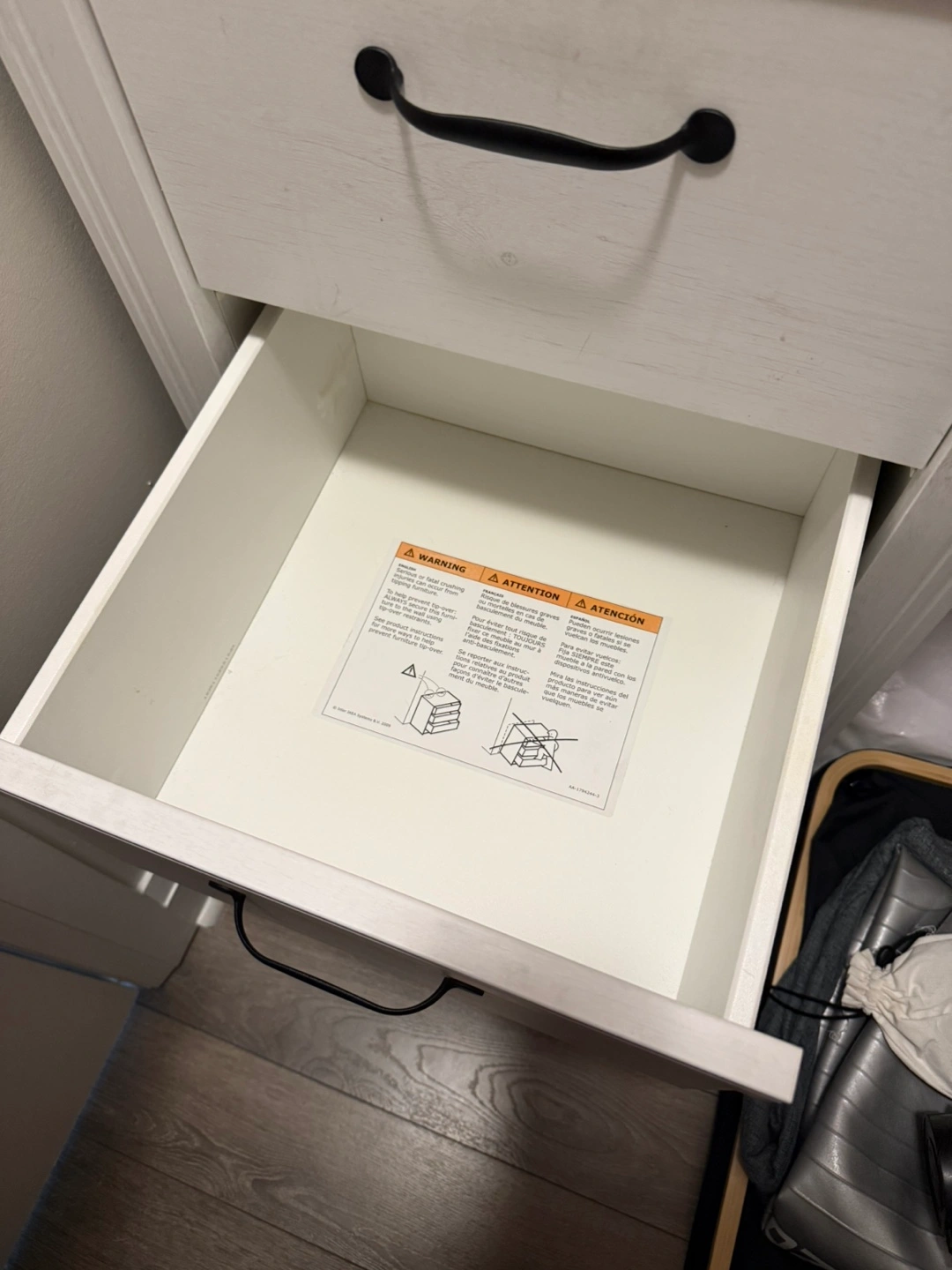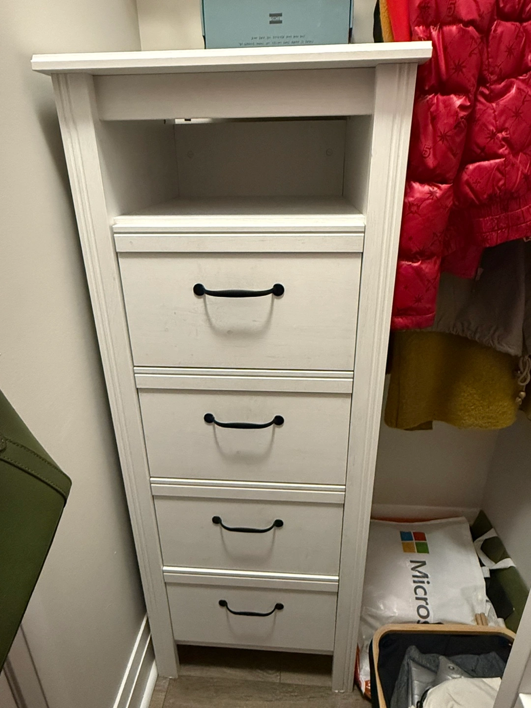 Here's a lovely white wooden storage cabinet with four drawers! It's perfect for organizing your space and adding a touch of classic style to any room. The drawers provide ample storage, and the clean white finish complements any decor. It's in great shape and ready for a new home!