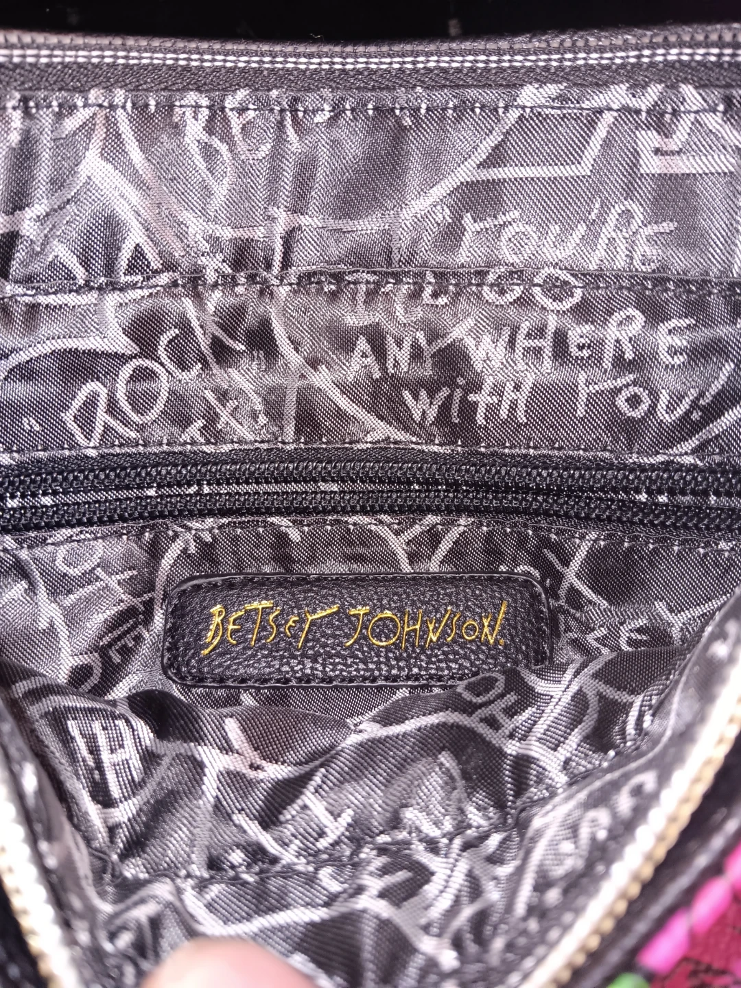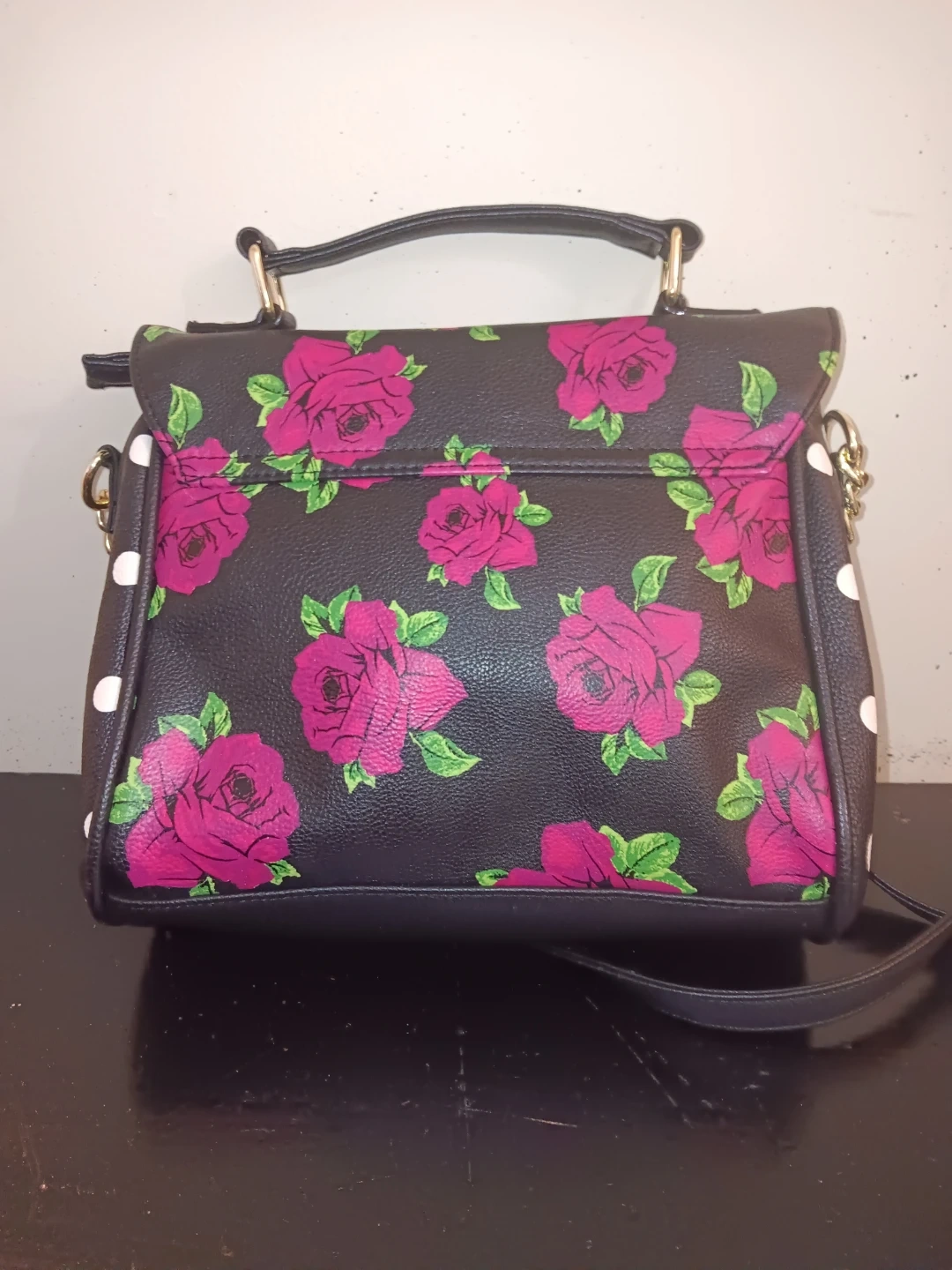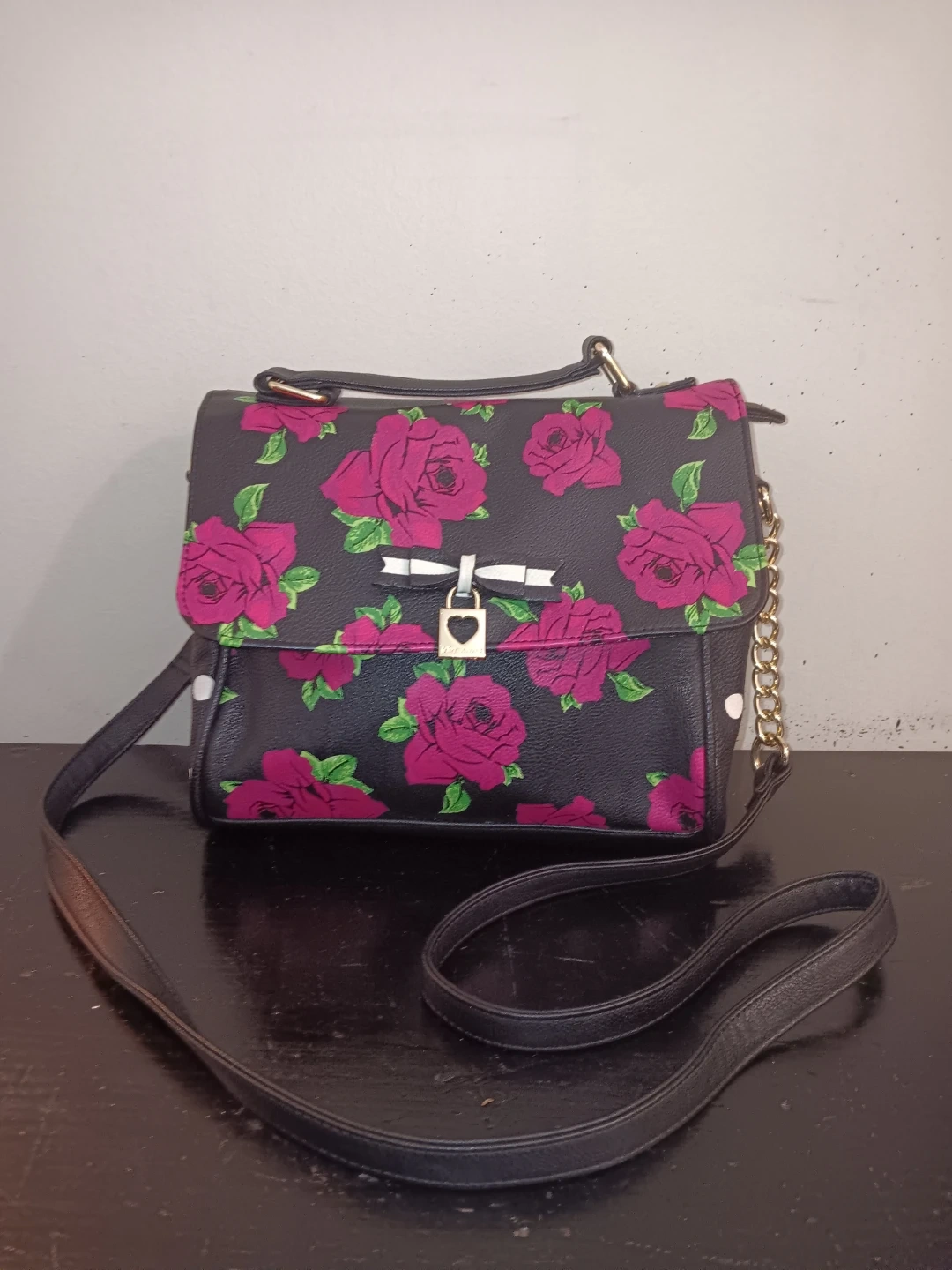 This Betsey Johnson satchel features a bold rose print on a black background. It has a top handle and a removable crossbody strap. The interior lining has a fun graphic print.