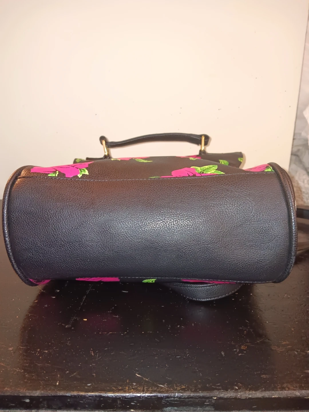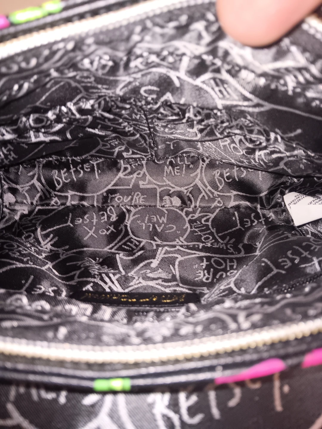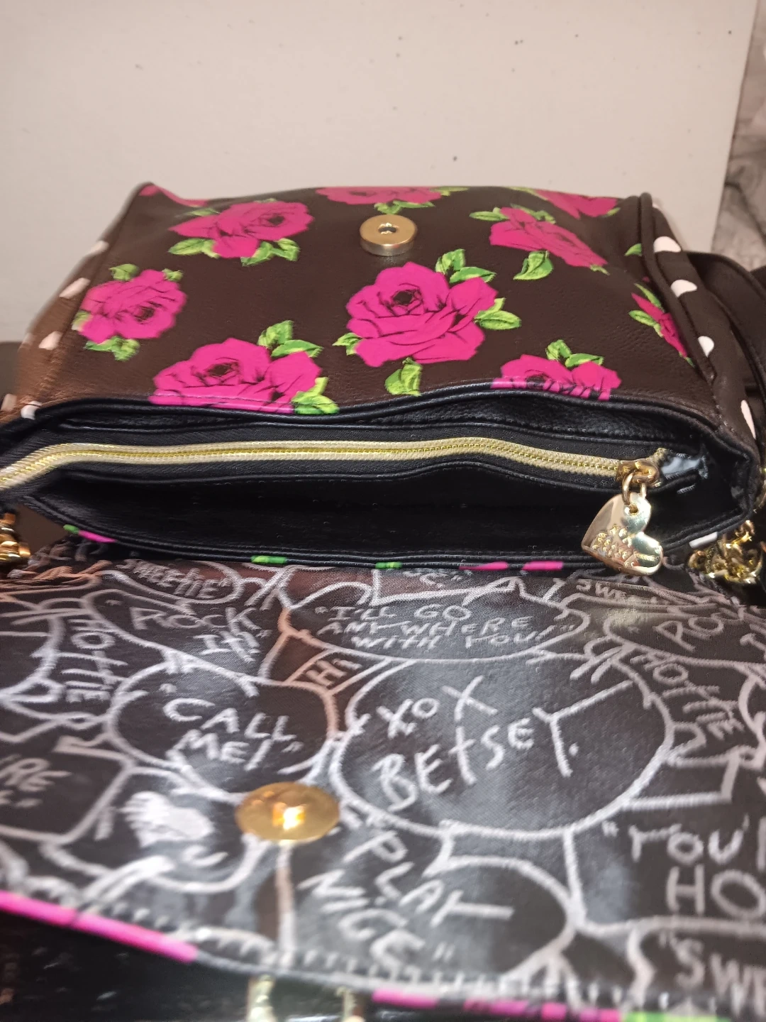 This Betsey Johnson satchel features a bold rose print on a black background. It has a top handle and a removable crossbody strap. The interior lining has a fun graphic print.