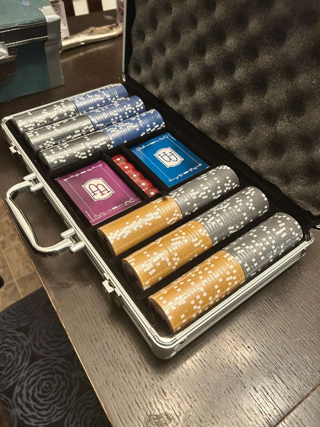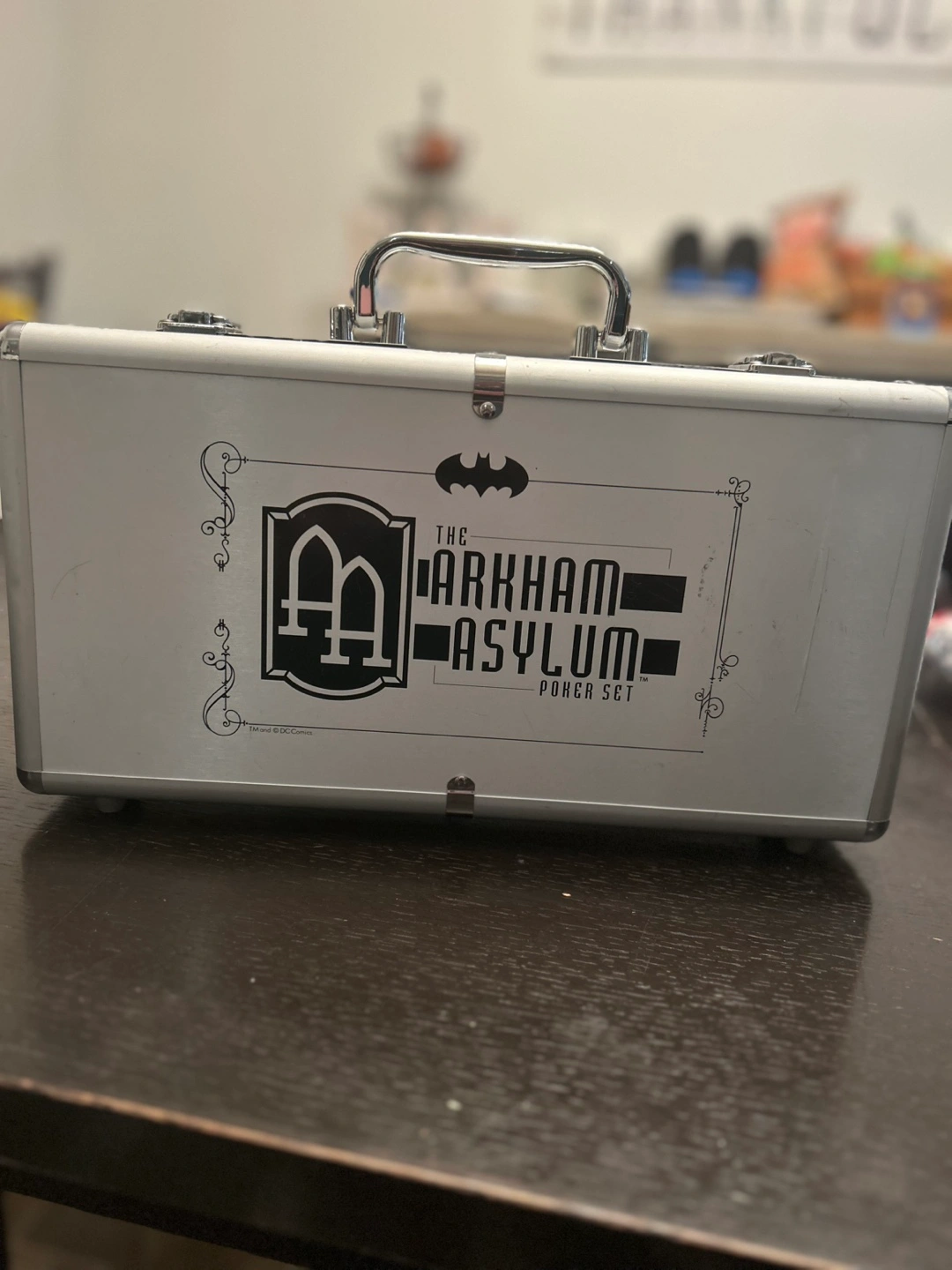 Aluminum carrying case. Includes poker chips, playing cards, and dice. Batman theme. Never used. Only 1000 made worldwide