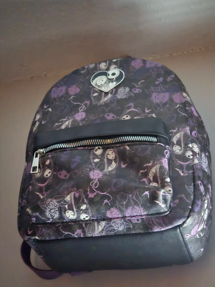 Selling a Loungefly backpack featuring characters from The Nightmare Before Christmas. It's in great condition and has a fun, spooky design with Jack and Sally. Perfect for fans of the movie!