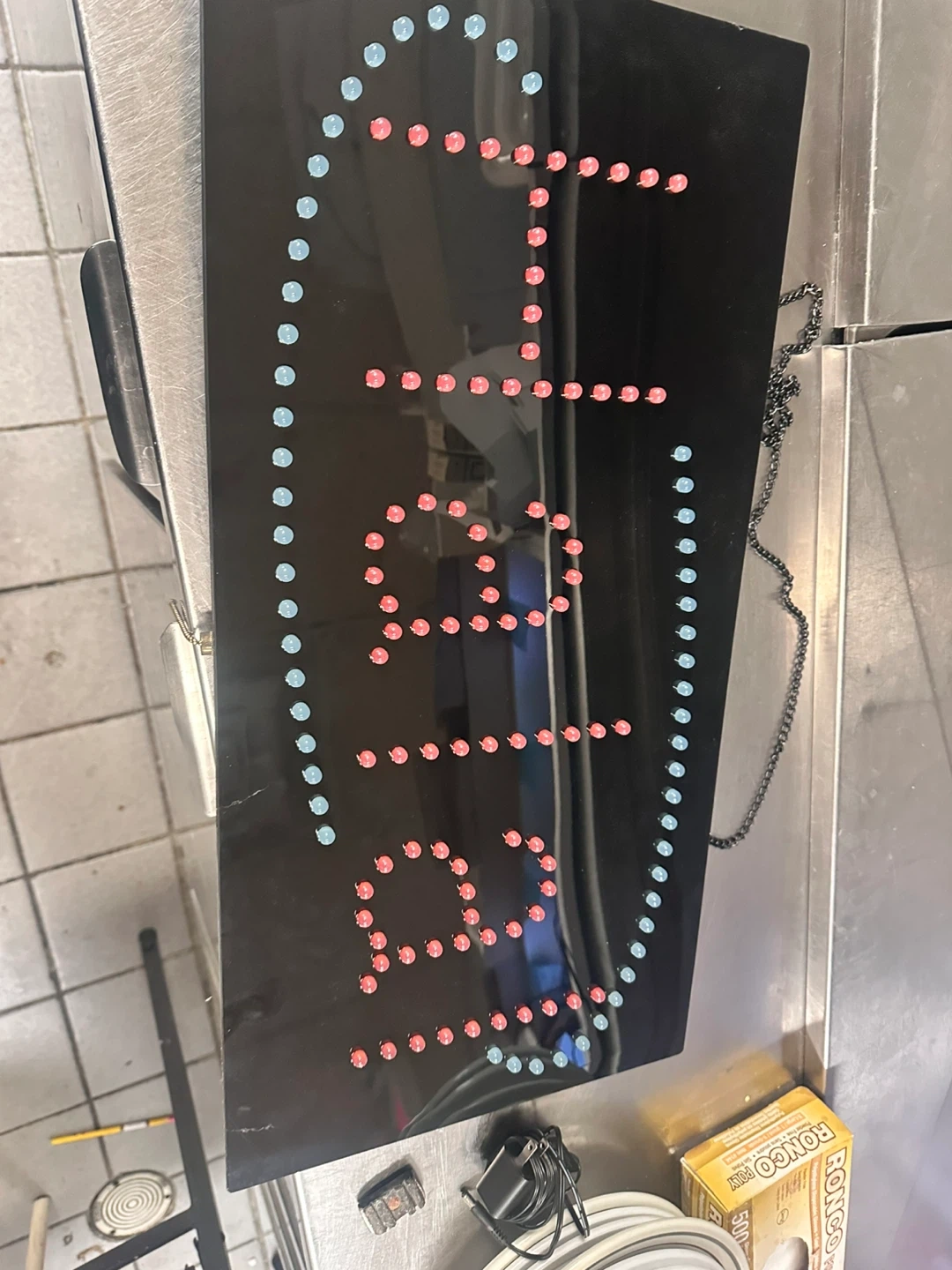 Bright LED sign displays 'HALAL' in pink and blue lights. It's great for attracting customers to your business. It comes with a power adapter and hanging chains.