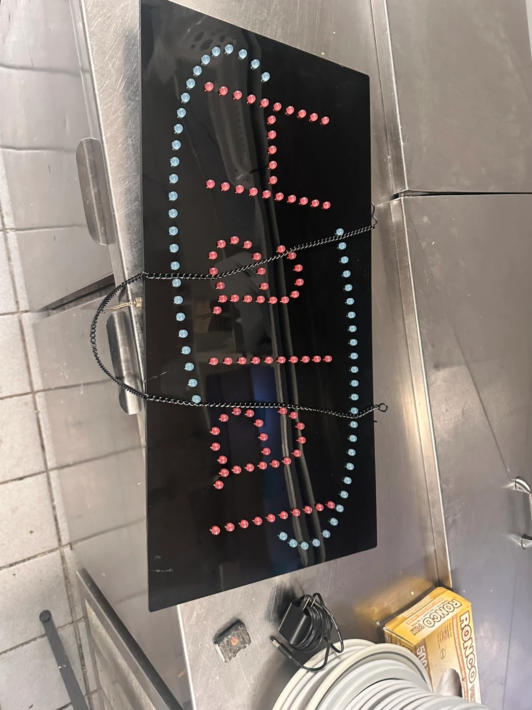 Bright LED sign displays 'HALAL' in pink and blue lights. It's great for attracting customers to your business. It comes with a power adapter and hanging chains.
