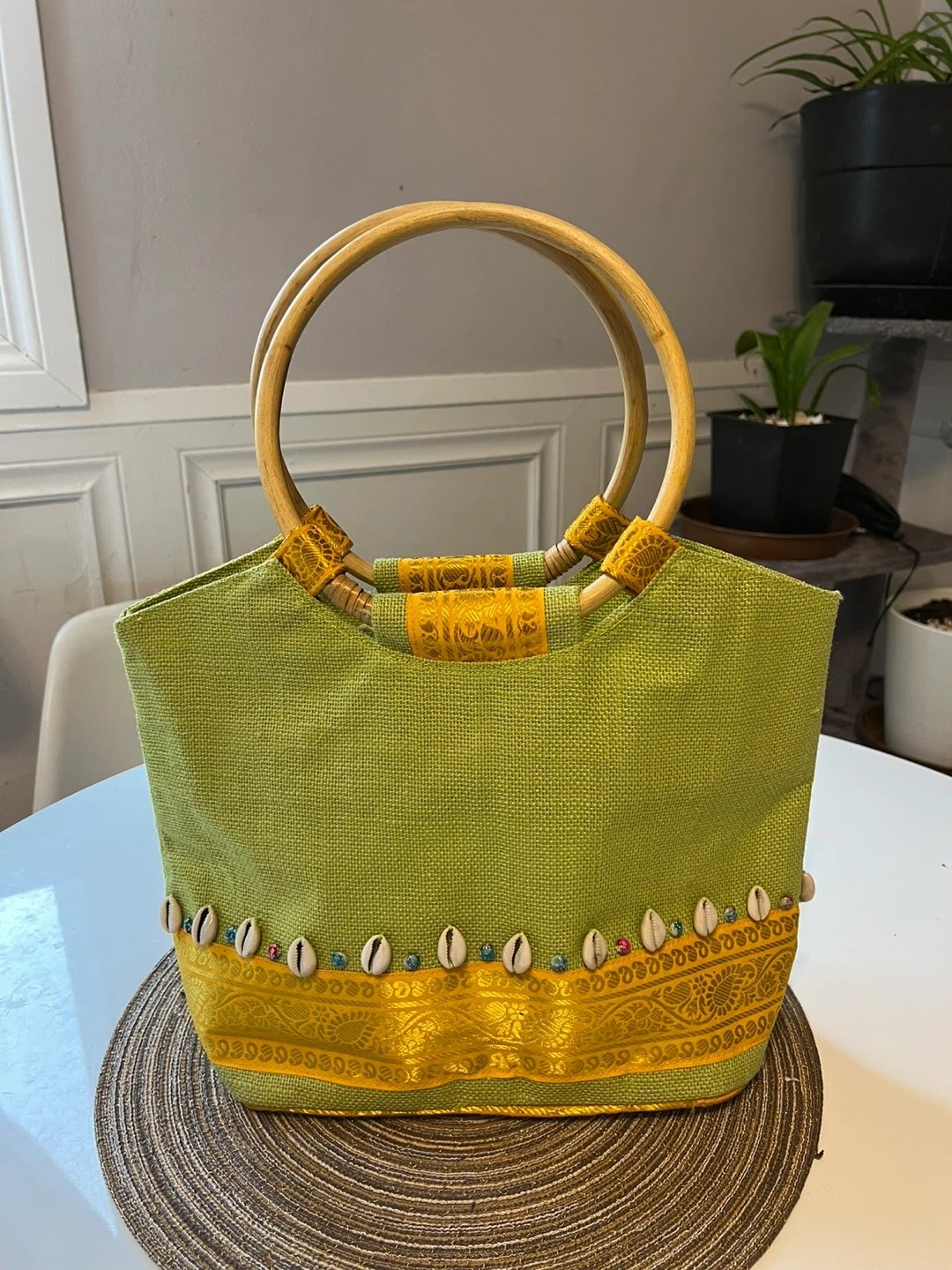 Green Jute Tote Bag with Bamboo Handles and Shell Embellishments
