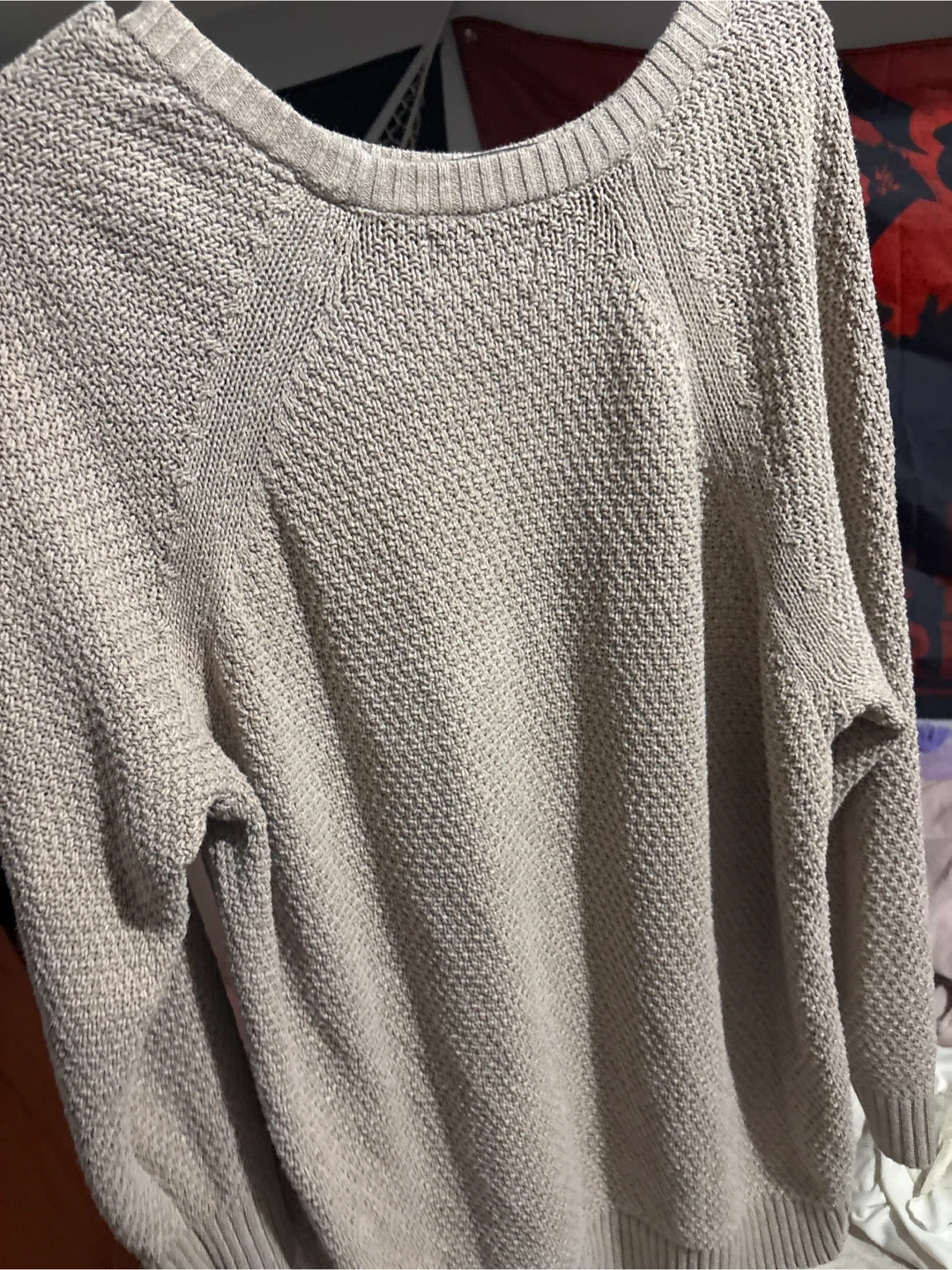 A cozy, textured knit sweater in a light cream colour. It's a raglan sleeve style with a ribbed neckline and hem. This sweater is a nice weight for cooler days!