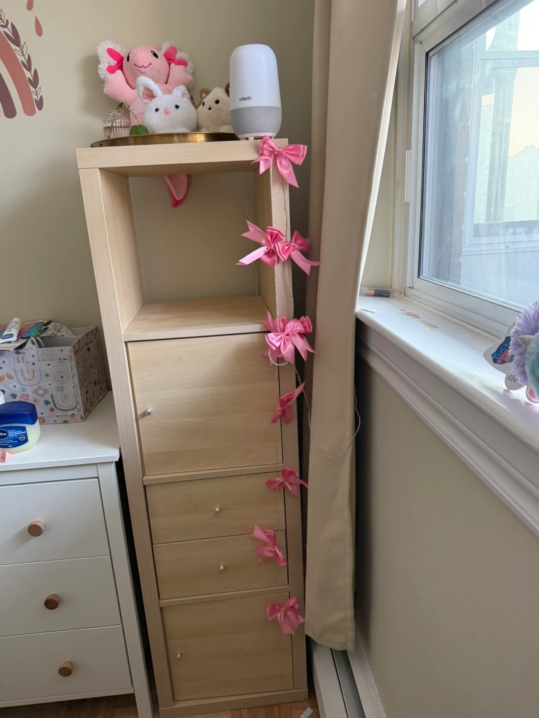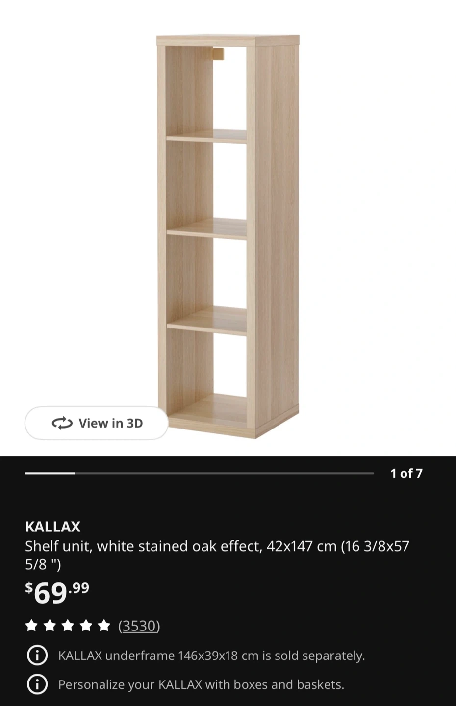 This is an IKEA KALLAX shelf unit in a white stained oak effect. It's a 4x1 configuration, measuring 42x147 cm. It comes with shelves for storage. It's a versatile piece for organizing your space!