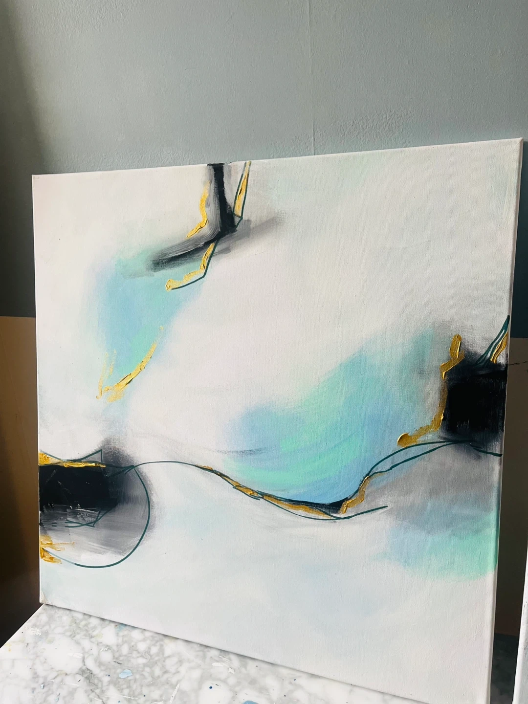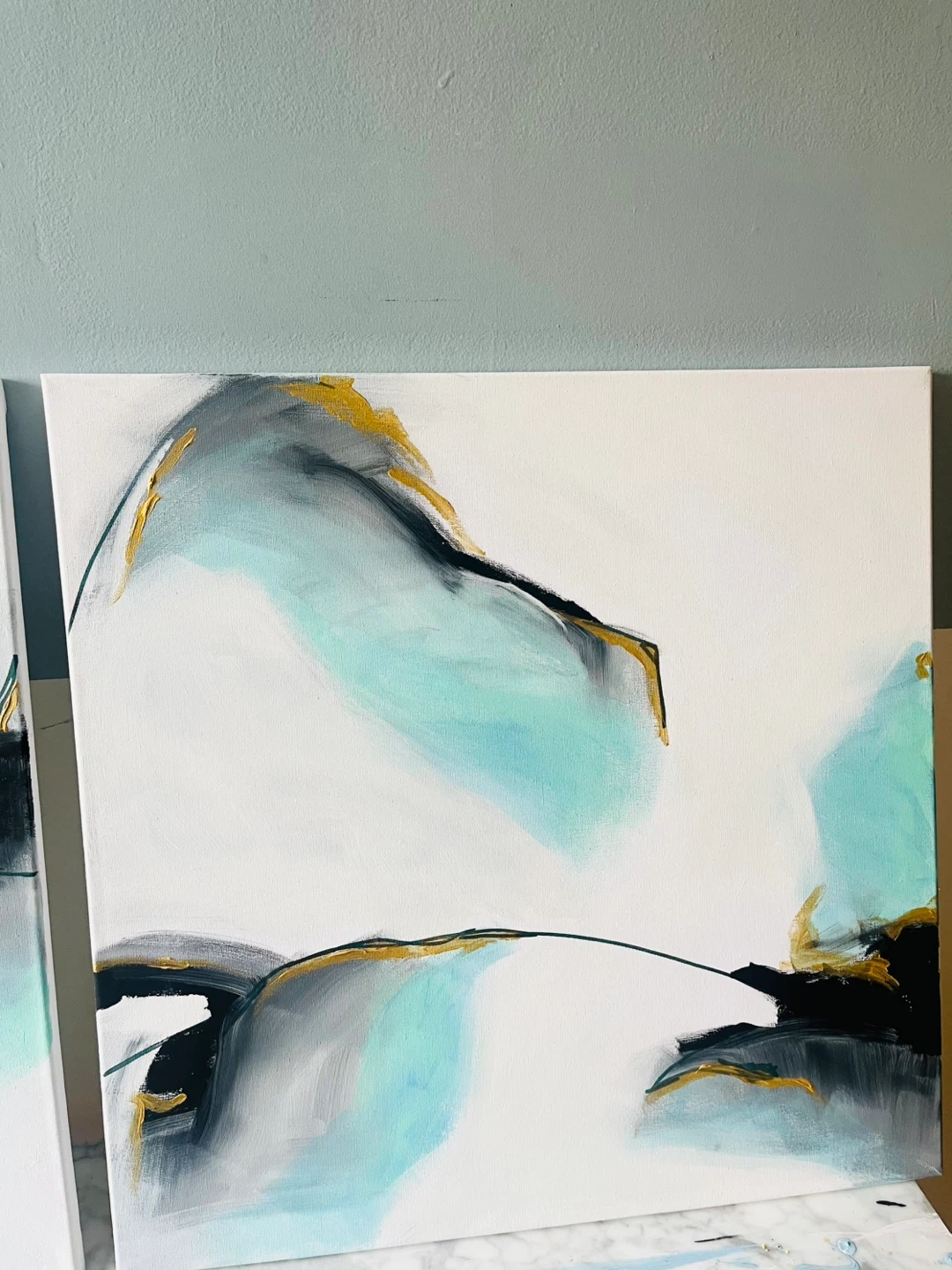 Set of two 2 ft x 2 ft abstract acrylic paintings on canvas. Features teal, gold, black, and grey tones with textured accents. Thick brushwork highlights. Can hang any orientation. Each piece has a minimalist, modern design that complements various decor styles. Ready to hang!