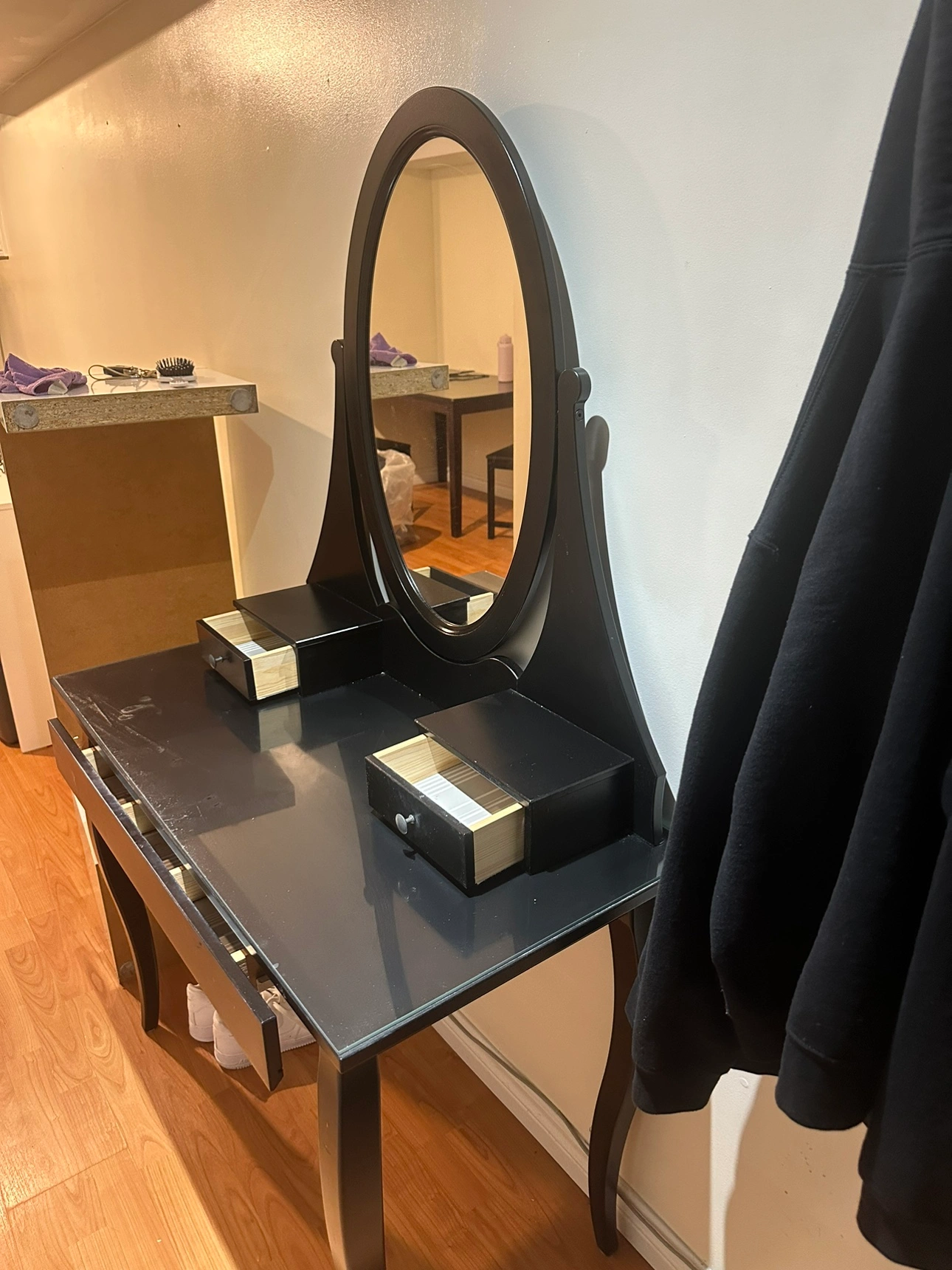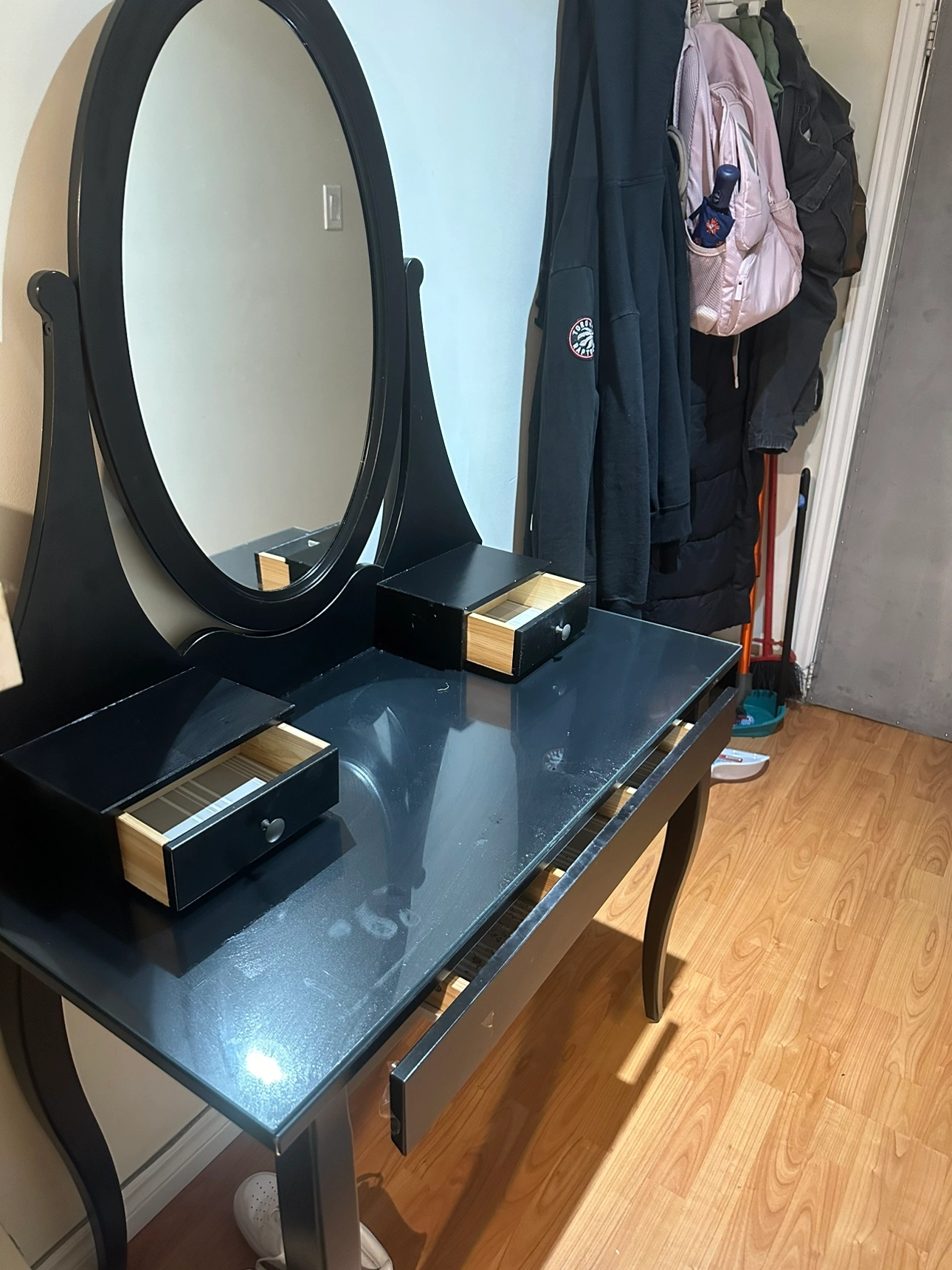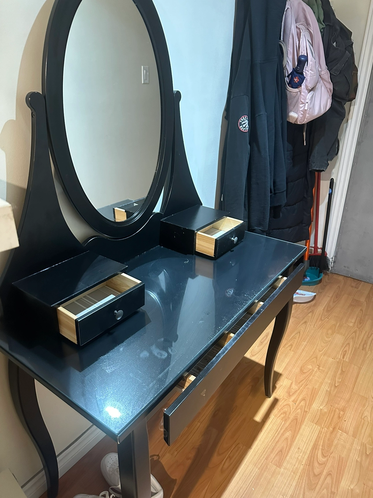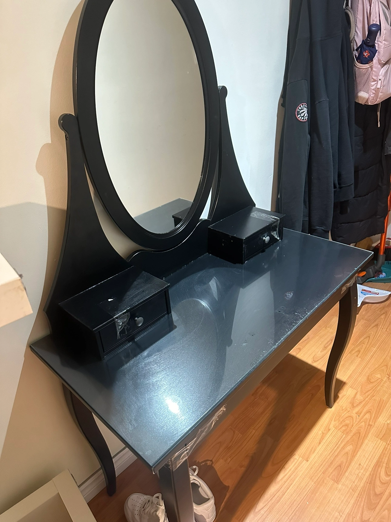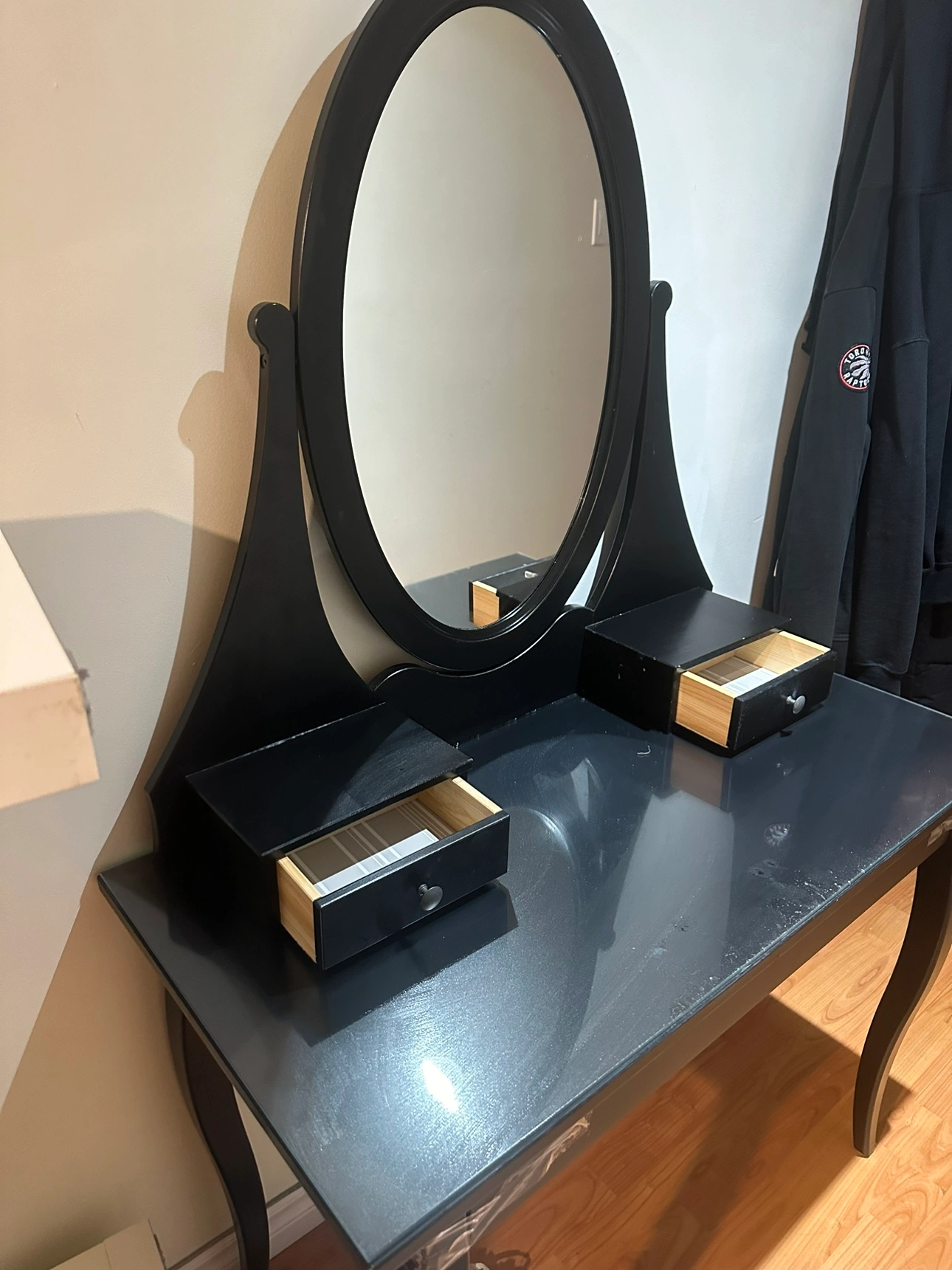 Buy & SellVanity with MirrorVanity with Mirror$70Black vanity with a mirror. Three drawers. Good condition.ConditionLike newWHERE TO MEETCheck LocationView MapSELLERManuelL'amoreaux9110 reviews1 chats·1 favorites·65 viewsSEND CHAT TO SELLERHi Manuel! I’m interested in your listing.Hi Manuel! I’m interested in your listing.Get the Karrot app to chatSign In to chat