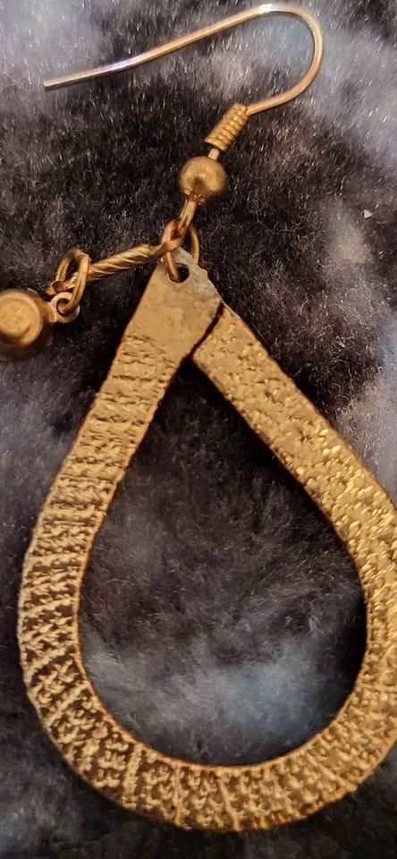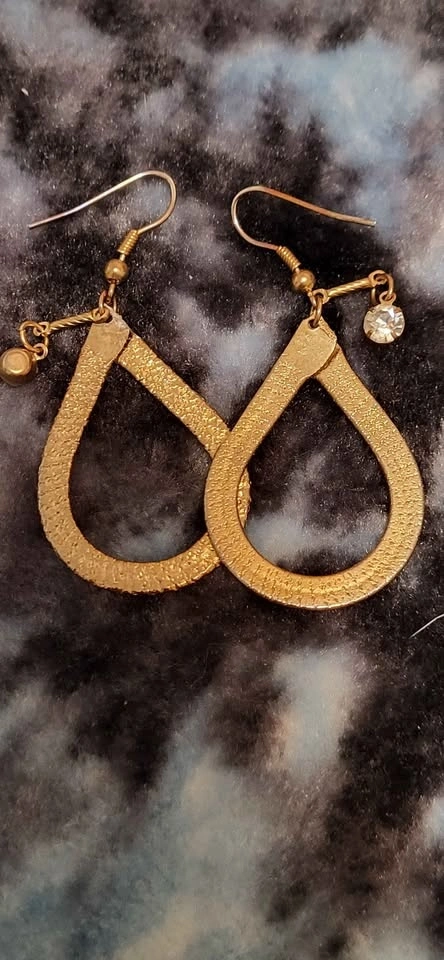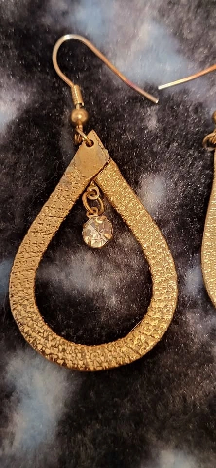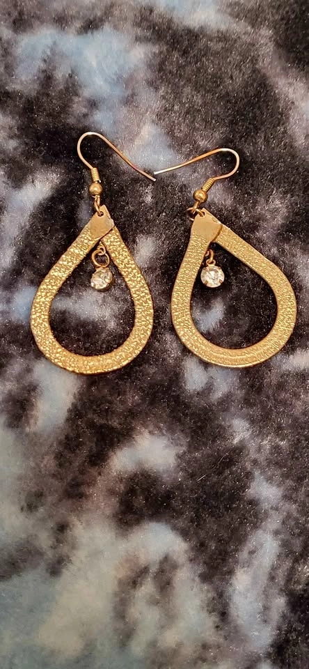 Textured gold teardrop earrings. Has a cool textured design and a little clear rhinestone dangle. Nice accessory for any outfit. There is a bit of corrosion on one of them.