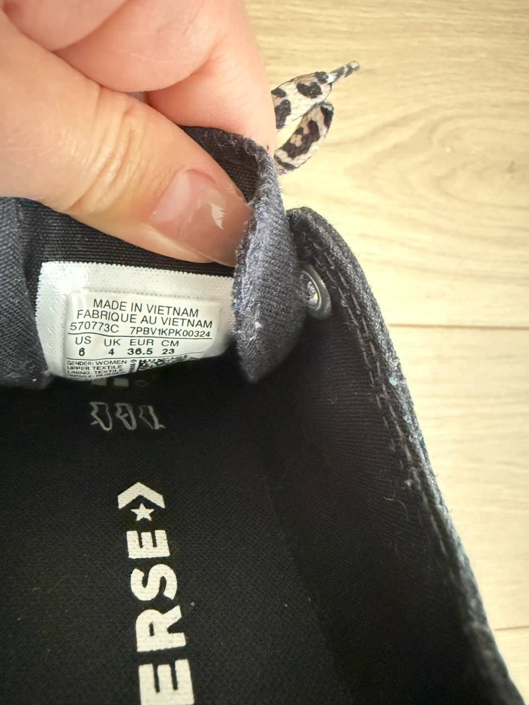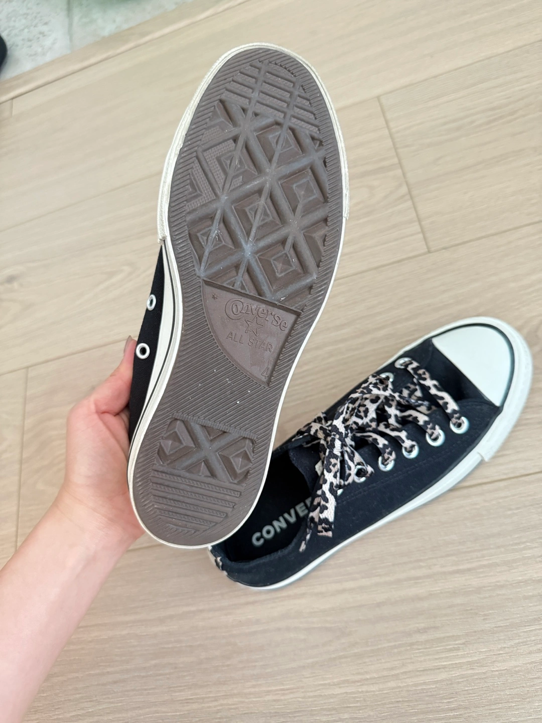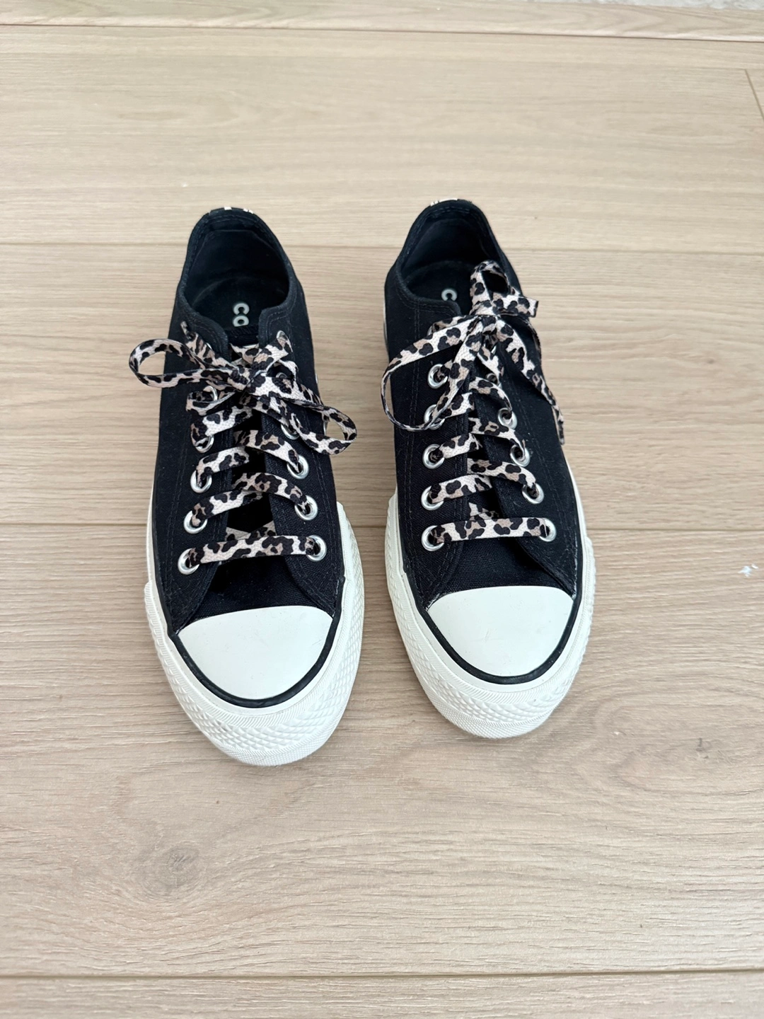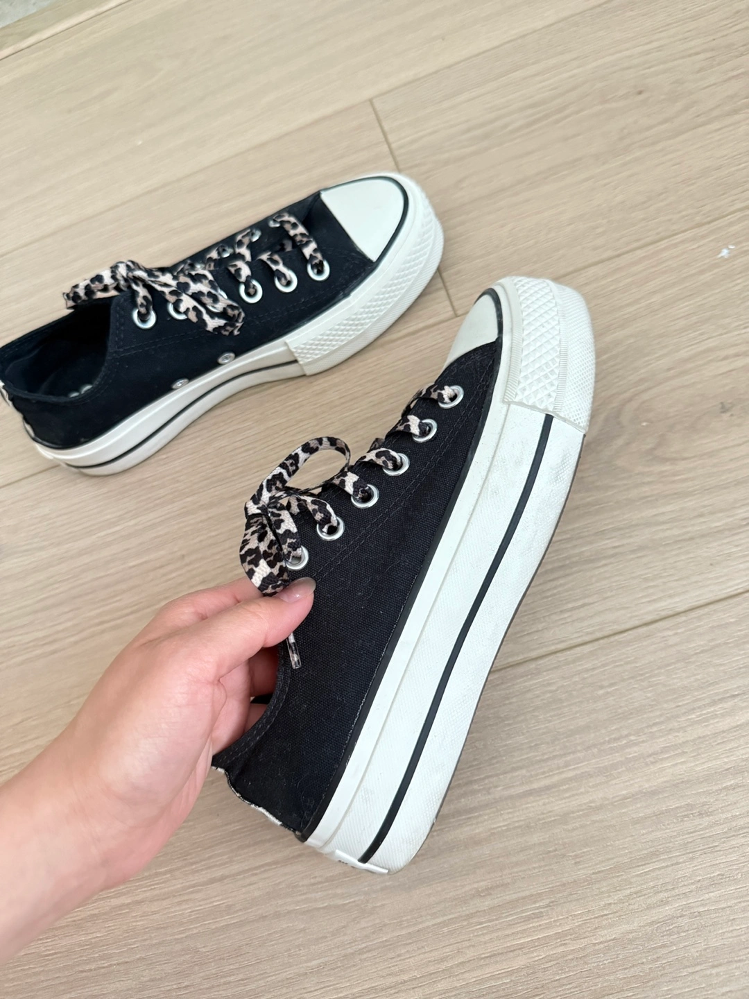 Selling a pair of Converse All Star platform sneakers in size 6 US. They're black with white platform soles and have fun leopard print laces! Perfect for adding a bit of edge to your everyday look