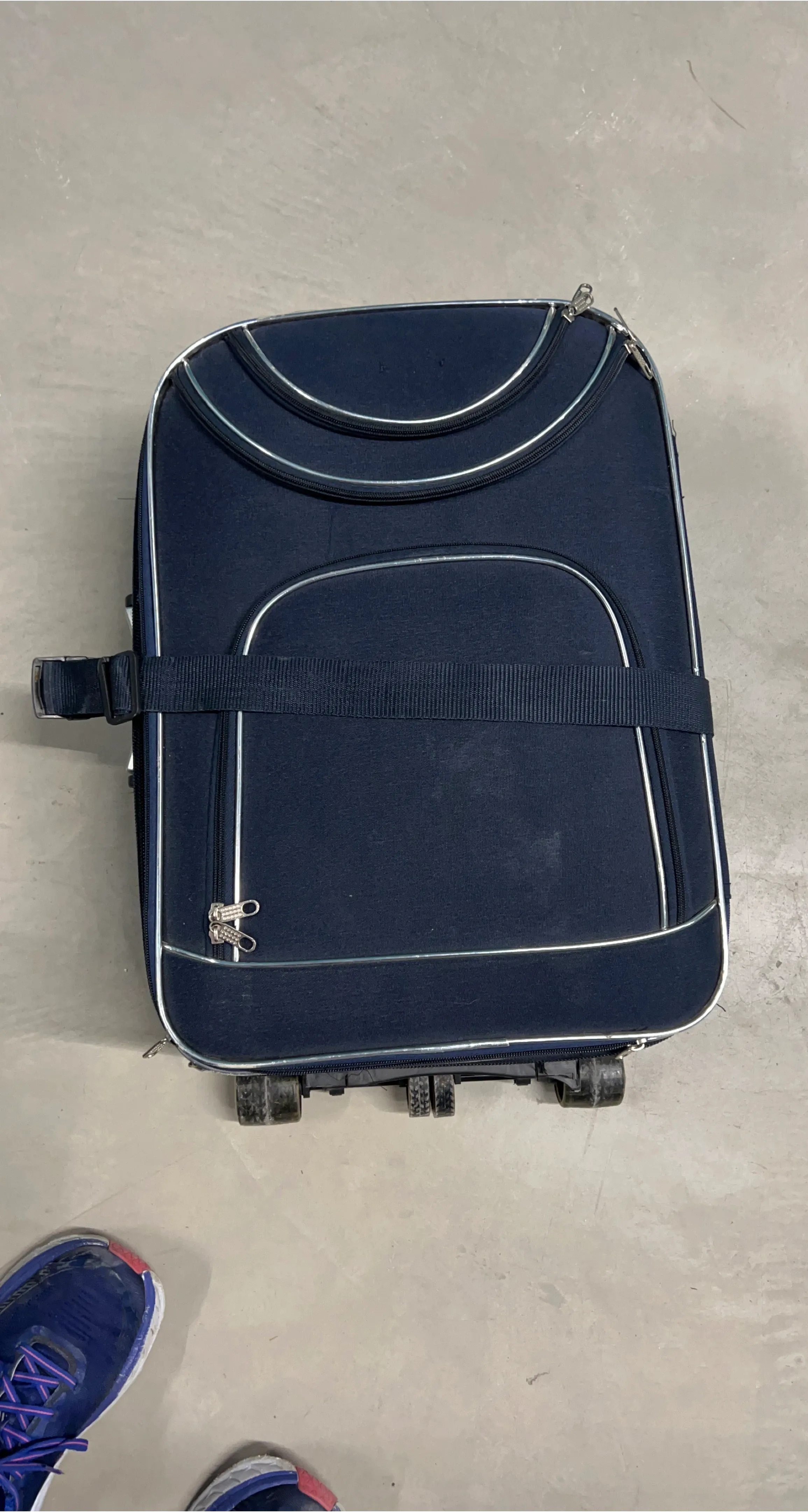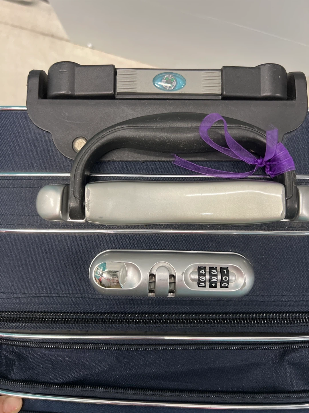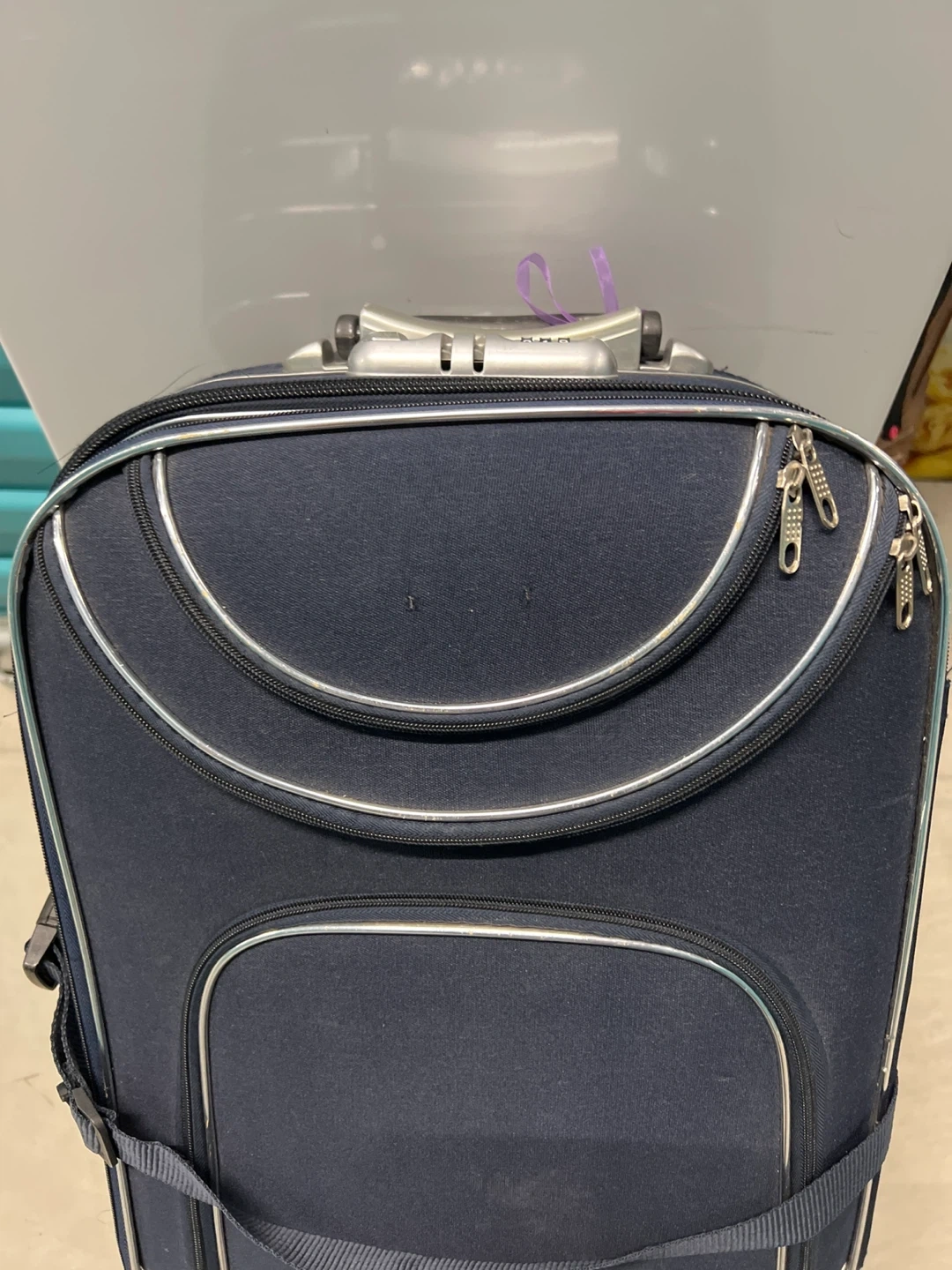 Navy blue soft-sided spinner suitcase with telescopic handle and built-in combination lock. It has four spinner wheels for easy maneuverability. Includes a purple ribbon tied to one of the handles.