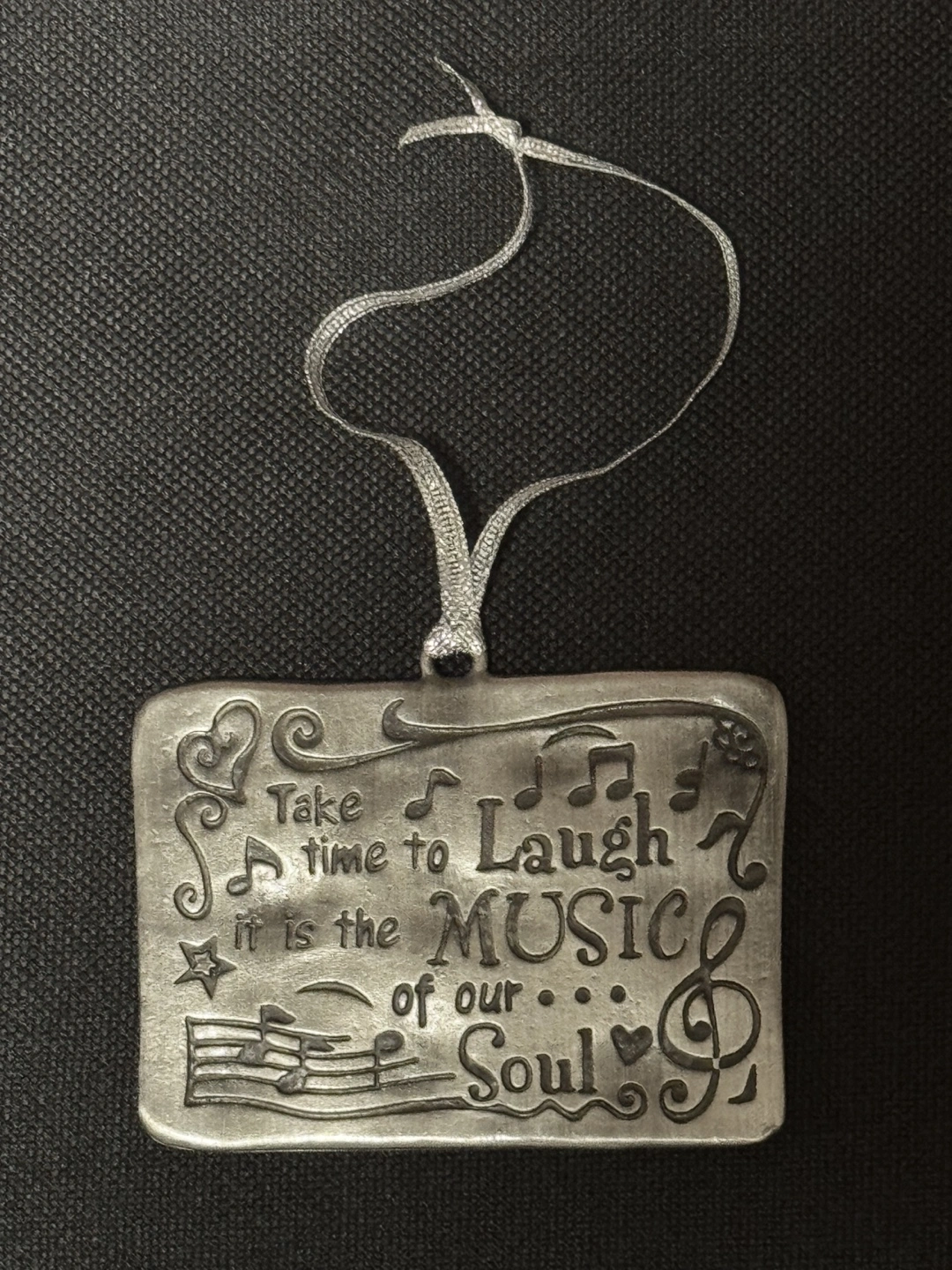 A lovely pewter ornament with the inscription “Take time to laugh, it is the music of our soul.” Perfect for adding a touch of charm to your home or as a thoughtful gift for someone special!