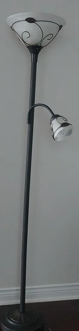 This torchiere floor lamp has a white marbleized glass shade with black scroll accents. It also features a flexible reading light. The base and pole are dark metal. Provides ambient and task lighting.