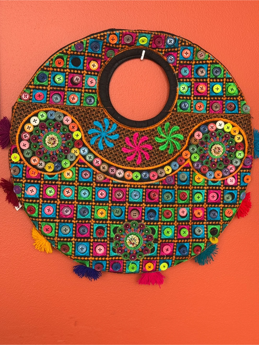 This unique tote bag is sure to turn heads! It features vibrant embroidery and button detailing. Perfect for adding a pop of colour to your outfit and carrying your everyday essentials. It's in great condition and ready for a new home!