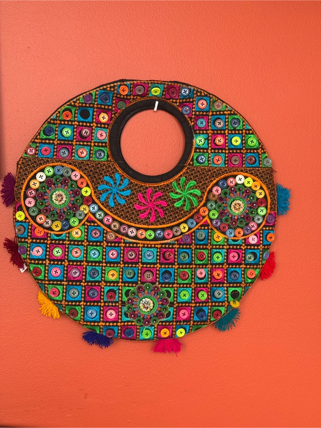 This unique tote bag is sure to turn heads! It features vibrant embroidery and button detailing. Perfect for adding a pop of colour to your outfit and carrying your everyday essentials. It's in great condition and ready for a new home!