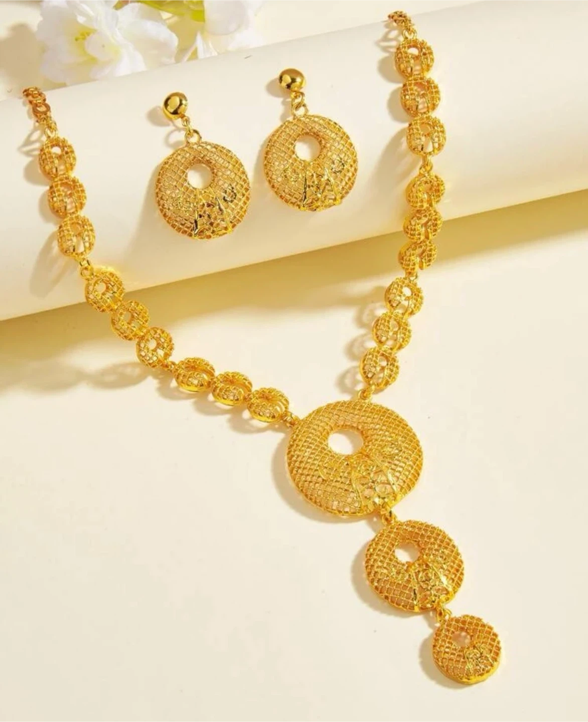 A matching necklace and dangle earrings set. Features a gold-tone finish with intricate circular designs. This set offers a touch of elegance.