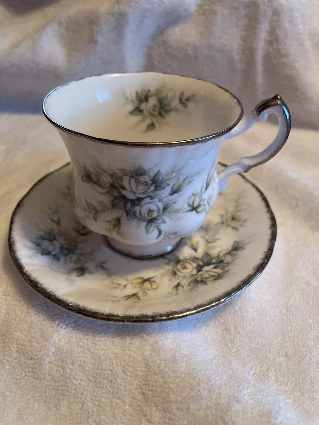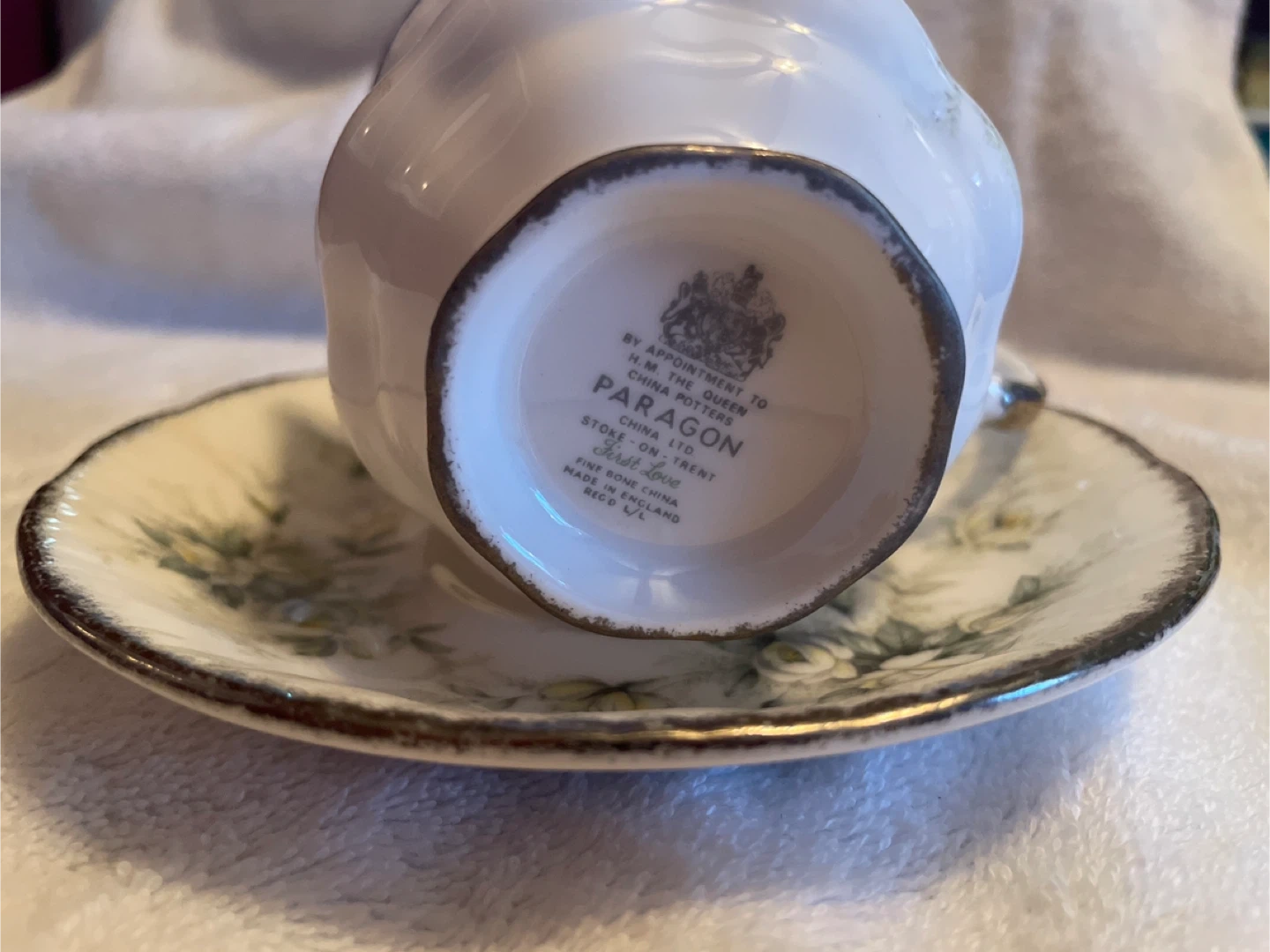 This is a Paragon fine bone china cup and saucer set from the 'First Love' collection. Made in England by Paragon China Ltd in Stoke-on-Trent. The set features a classic design with a gold rim.